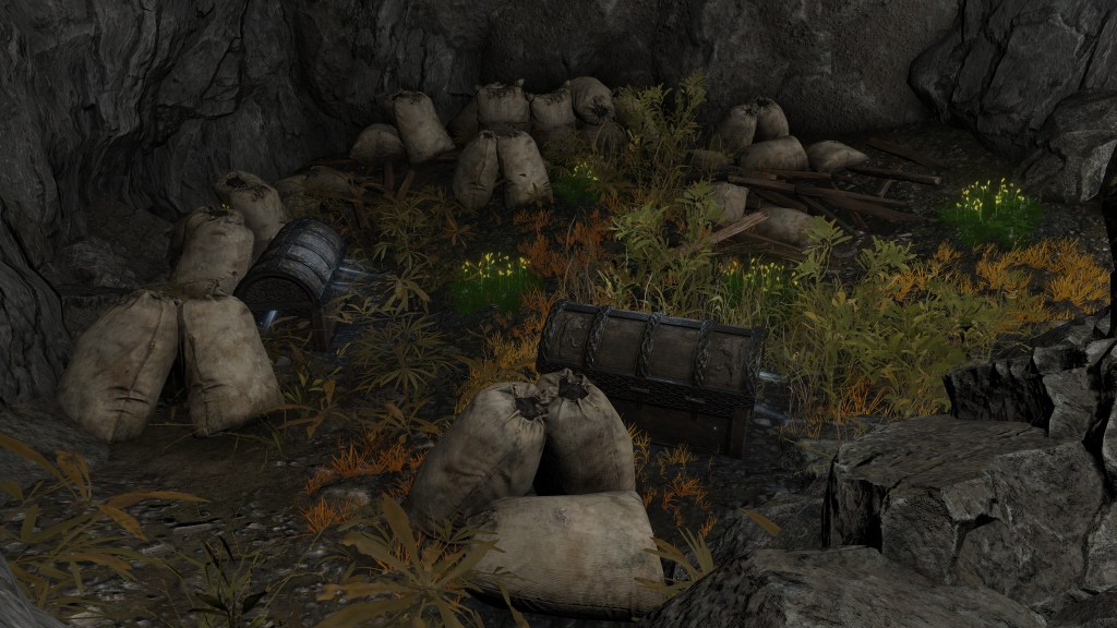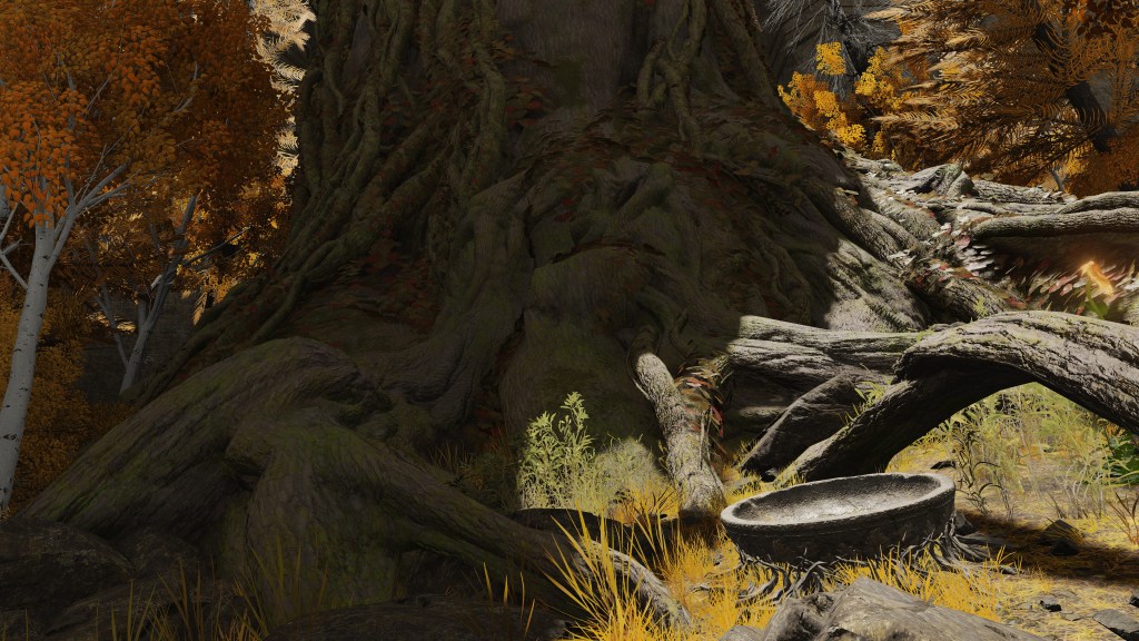 The local grace point labels the wood as the “Forest of Plenty”, (豊穣の森) suggesting a particular connection to the Crucible’s era. Cementing the association, we obtain the Icon Shield from a chest at Site W. The delicate painting of the Age of Plenty implies that the painters fervently wished to preserve memory of the Crucible’s abundance. The woodfolk are certainly faithful, given a nomadic warrior in the area wrote a cookbook detailing how to make warming stones; a cliffside graveyard likewise affirms their commitment to Erdtree Burial. And where better to chase that memory than at the surviving remnants of its existence? In short, the woodfolk are believers who founded their village beneath a vestige of the original Erdtree now lost to them. They wish for more than just an abstract object of worship, but an actual idol. This is the place where those most dedicated to the life of the Crucible come to live in harmony with nature under the lesser tree’s shining shade.