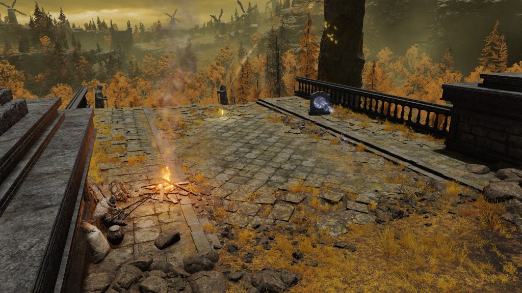 We do see a lone guardian sitting gazing at the Minor Erdtree from Site W, next to a similarly seated corpse praying to said tree. This location is already weird. Although clearly part of the ruins from a bird’s eye view, this collection of two buildings sits upon the cliff far above the rest of the village. But why would a guardian be there? While his kind can be found some ways away from the Minor Erdtree they are guarding, it is typically to block the road leading to it. But these ruins are nowhere near the main path to the village below. The guardian is simply idling at an abandoned, isolated building, without compatriots. Why? Maybe because he is the martial arts instructor. The guardians must have learned their unique fighting style from somewhere, so why not from the first, born among the woodfolk? The two clifftop buildings are perfect for a dojo and dormitory, students coming to focus on training combat and spirituality needed to make the pact. And once they mastered the arts, they left their master to serve their Erdtree of choice, leaving him to await his next pupil.