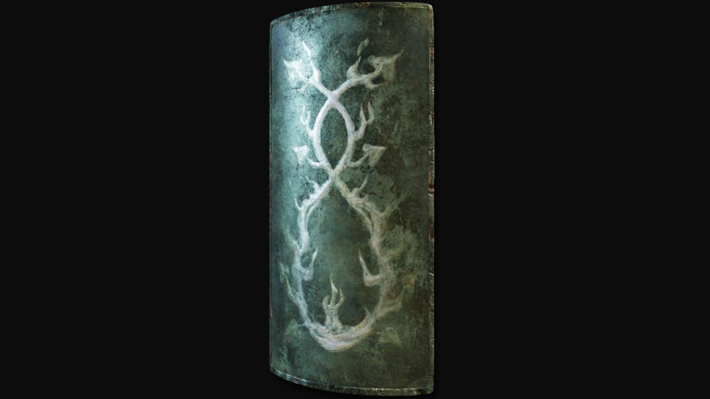 For a more domestic example, there are the Woodfolk Ruins (Site W) back at Altus, sandwiched between gorge cliffs and its Minor Erdtree. Like with Eochaid, the chances of a golden seed landing right next to a random village are infinitesimal, especially one in a remote part of the woods far from any highway. It is more probable that the village was built by the tree after it suddenly emerged. Adding to that impression, we can purchase the Crossed-Tree Towershield from the nomadic merchant south of Site W. Its description makes a point of the face depicting an old tree as its forked form intertwines, bringing to mind a budding plant burgeoning but ultimately coalescing into a singular support — like, say, a tree born of the Crucible. Altogether, we can infer that people were attracted there because of the Erdtree’s offspring growing in that sunken forest. The only difference from Eochaid is the motive behind the community’s captivation.