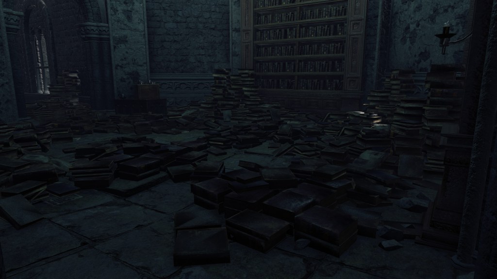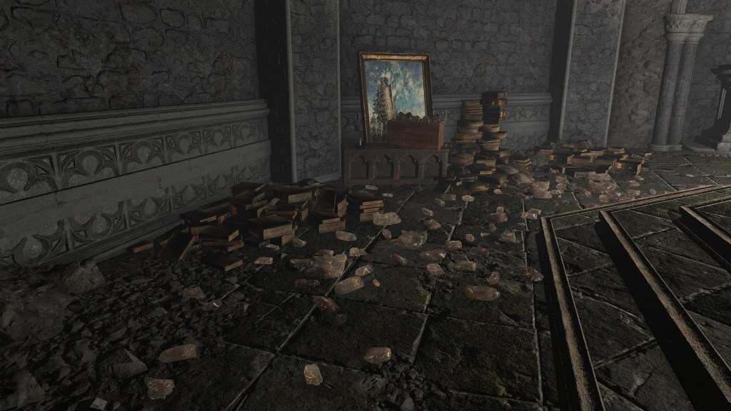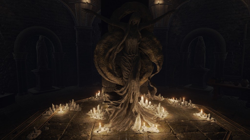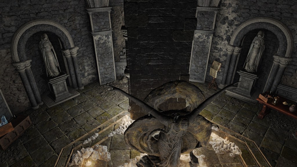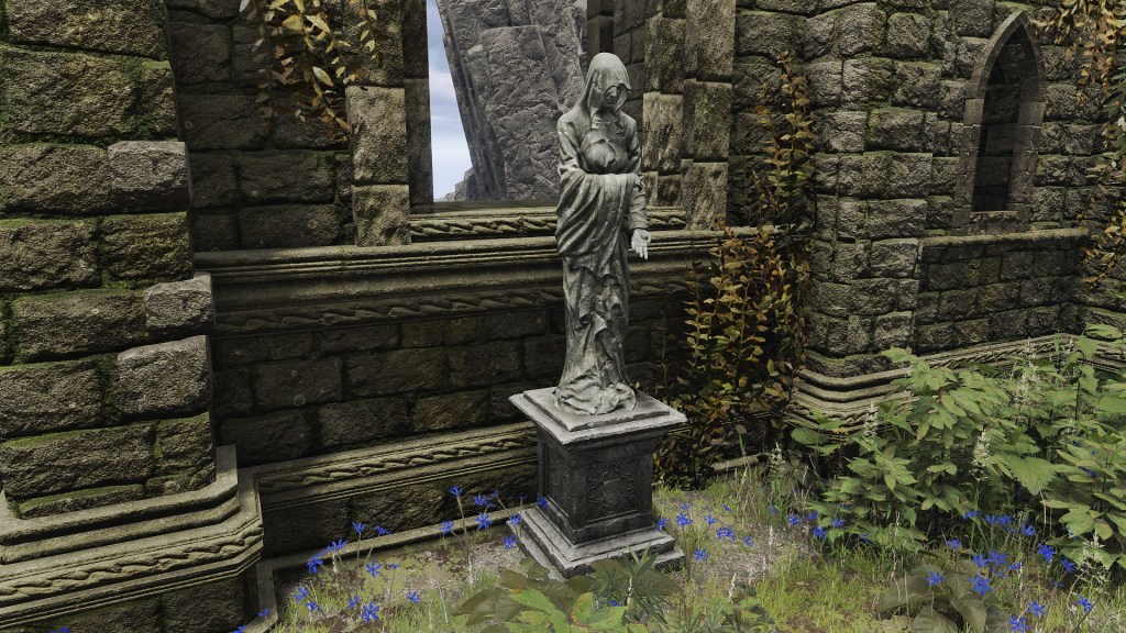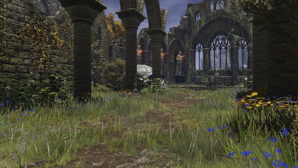 The building itself was just as important. Larger than most church ruins we come across, the Church of Vows was worthy of such a grand celebration. Construction was handled chiefly by Liurnia based on choice of iconography. Off to the sides after entering loom statues of a woman wrapped in robes. Although this same asset was first used in Dark Souls III (DS3) to represent the High Priestess of Lothric, the new context equates them with the witch statues so commonly identified with Rennala. The reason for the different model can be derived from the figure extending a welcoming hand to passers-by — any who enter the church are warmly received by the sorcerers. The apsis is likewise decorated with the saint statues used at the Carian’s own cathedral on the Moonlight Altar, only holding up torches to herald the prospective wedding. The floor is similarly covered in a mix of both the gold and blue flowers associated with their respective civilizations to highlight both sides coming together.
