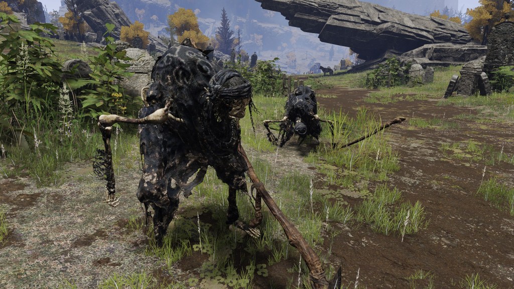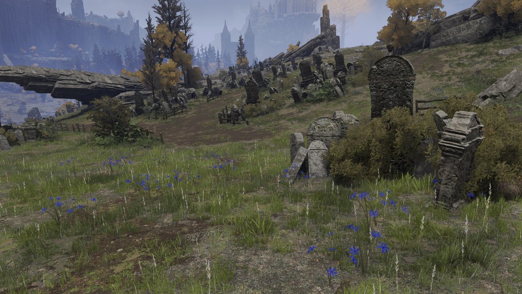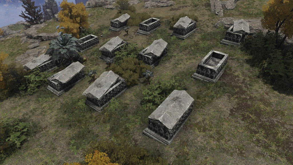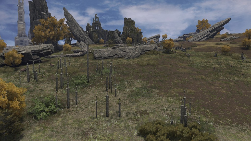 However, she still underestimated the strength of Caria’s knights. Despite numbering fewer than 20, they were all on par with the best of Leyndell’s heroes, Radagon included. Moreover, they had been preparing, too. The Carian Knight’s Shield was designed to resist holy magic just as much as glintstone sorcery, showcasing their full expectation of Leyndell’s betrayal somewhere down the line. Neither party had the severe advantage in this clash, leaving the battle at a stalemate. It didn’t remain so for long, however. Beneath the adjoining bridge is a scarab possessing Shield Bash. Like Shield Crash, this ash of war invokes the idea of attacking whilst defending, in this case against an enemy already upon you. Taking that into account, the sorcerers defending the gates must have launched a counterattack to push the golden army back. The academy’s wisemen understood the proverb that offense was the best defense. And as we can see from the collection of graves only a little further east of the war’s sword monument, there was another major skirmish halfway up the Bellum Highway.