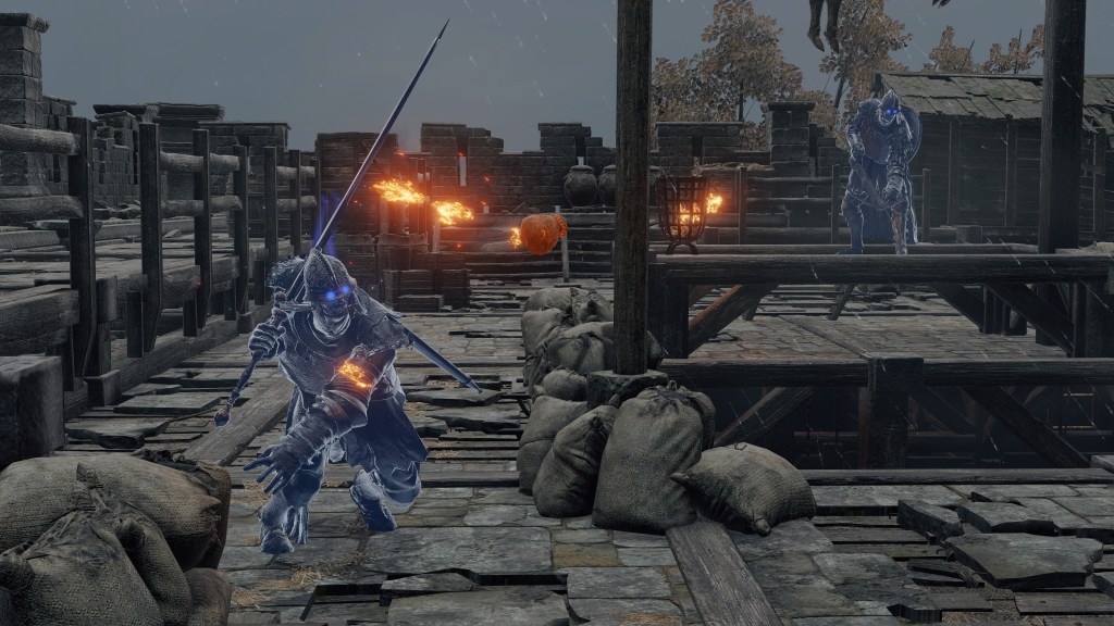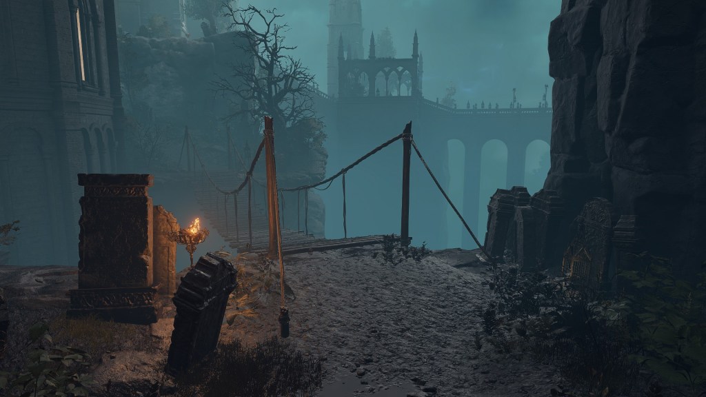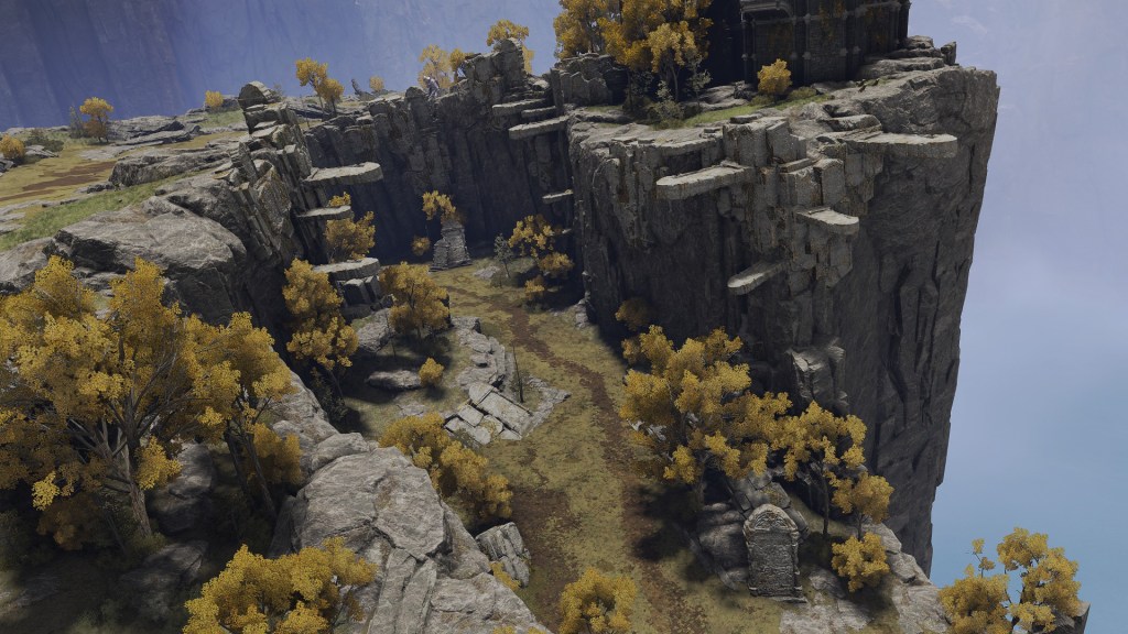 Marika’s stay might also explain the unique defenses. Rather than commit to a proper fort, the Erdtree forces settled for a simple walled enclosure and smaller lookout post. Protecting the queen was obviously paramount. However, there were other complicating factors. For one, building any permanent defenses takes precious time away from the actual invasion. Moreover, it makes them conspicuous. One doesn’t need to attend a mountaintop academy to see the walls and towers rising from the opposite clifftops — the sorcerers would be aware of Leyndell’s infringement almost instantly, and no doubt mobilize just as fast. The god’s army simply couldn’t afford to build anything too complicated before the Carians came marching. But in that case, why build such defenses at all? If the plan was to surprise the enemy from an unexpected angle, revealing any signs would be detrimental. And yet, signaling their exact location was probably the intention from the start.
