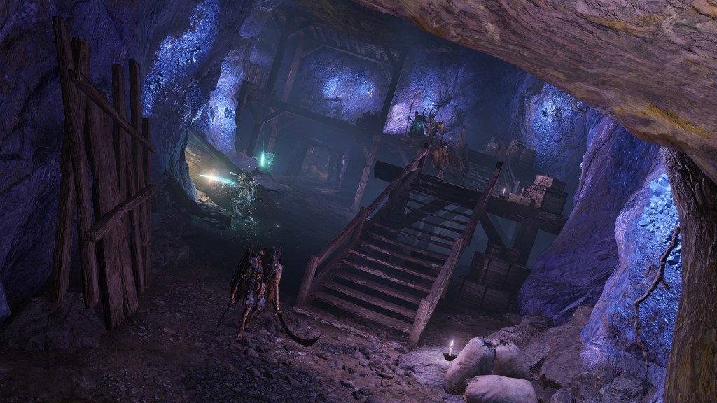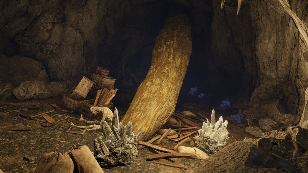 By virtue of its name, the Altus Tunnel is the more recent of the two mines on the plateau beyond Capital Outskirts. It is also a crystal tunnel, the sorcerer miners extracting numerous cracked crystals from the root-entwined earth along with the golden smithing stone. Overseeing their work are marionettes and a couple of Crystalians — the former common craft of the academy, the latter contracted friends of the Carians. All of these elements make it plain that this is a Liurnian operation. This stands out as odd, however, given the mine’s location next to the Woodfolk Ruins. (Site W) That village was squarely home to the faithful on the plateau, so why were sorcerers there conducting mining operations? Of course, both the Liurnian Wars and the village’s formation were occurring around the same time, after the end of the Crucible. It wouldn’t be odd then if the crystal deposit was discovered after the wars, prompting the Erdtree kingdom to alert its neighbor and offer them the mining rights. The village was definitely drawing foreign sorcerers to the gorge.