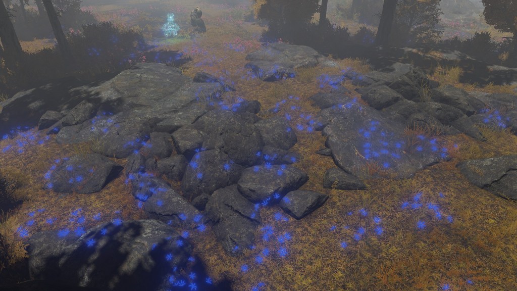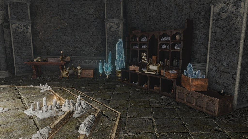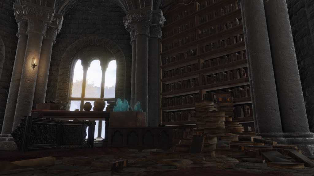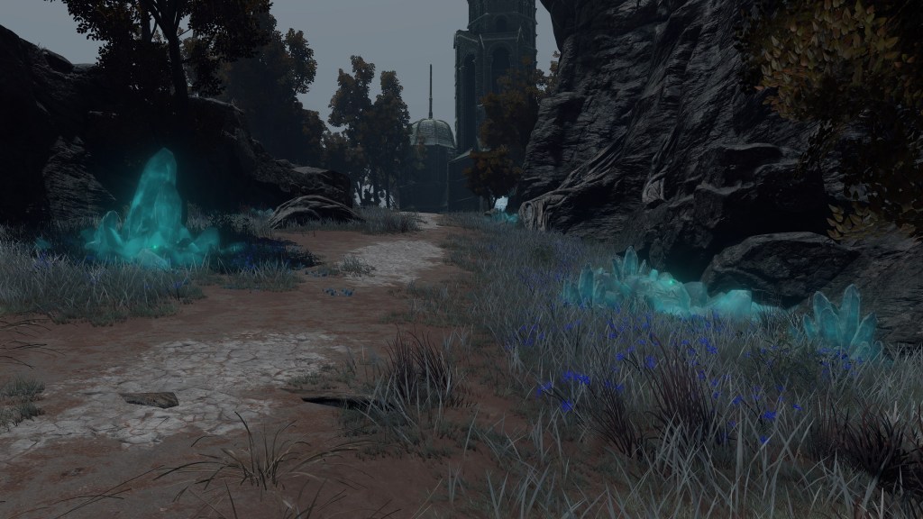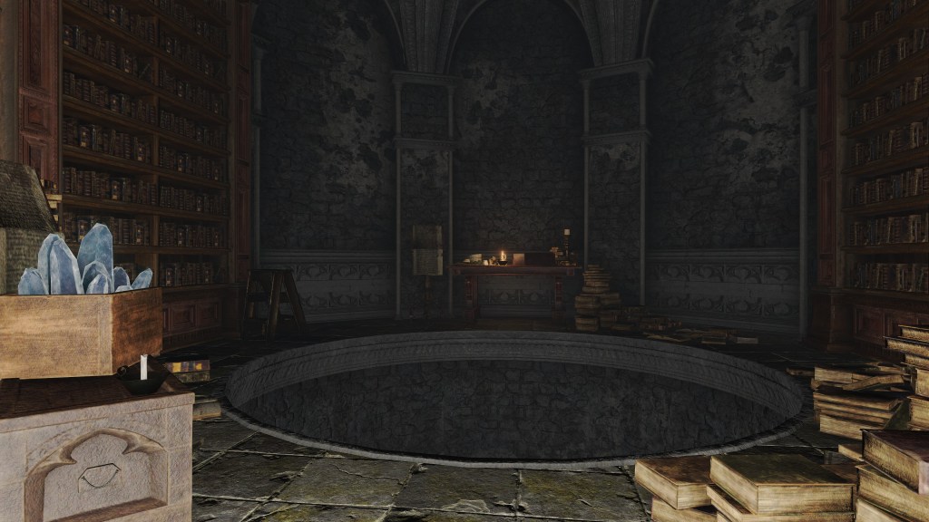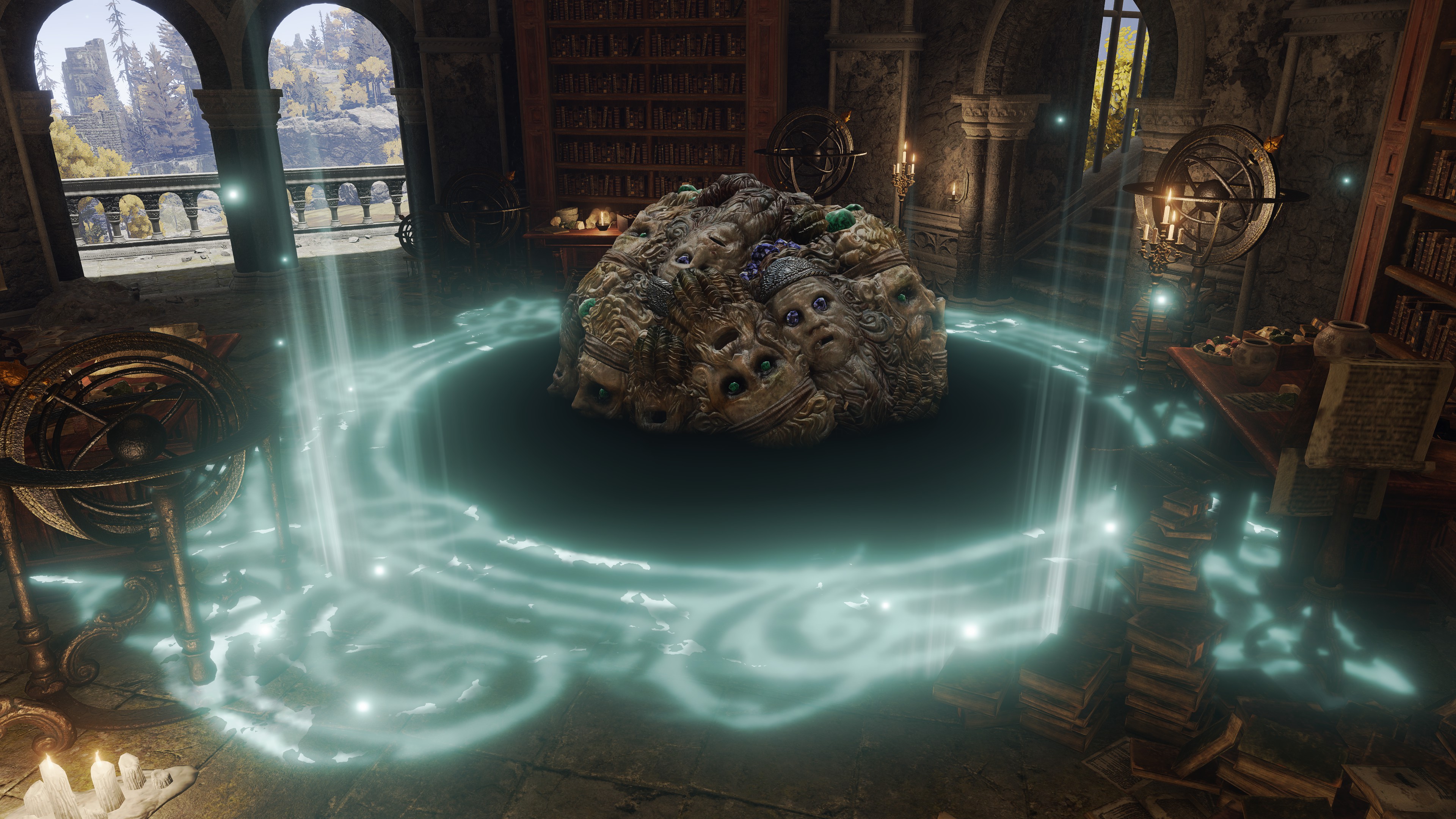 South of Site W lies the curious Mirage Rise, disapparating upon our approach. If the familiar architecture and glowing blue flowers around the property weren’t clear, the academy seal and witch statues inside firmly tie the tower to Liurnia. However, the owner’s area of interest is decidedly odd. The furnishing arrangement is mostly bog standard — copious bookshelves, a few armillary spheres, a single painting. The chest in the private workspace, however, stores Unseen Form and Blade. The only thing more bizarre than these Sellian sorceries are the gold crystals scattered across the floor. It seems that the owner, dead in his chair at the top of the tower, was fascinated by illusory magic. This explains why his tower is like a mirage, only becoming visible — and tangible — when we have solved the puzzle and dispelled the seal. However, he wasn’t so narrow-minded in his pursuit as to limit these studies to glintstone. Having likely been staying at nearby Site W, the man sought private research on the gold produced by the local Erdtree. Perhaps the researcher discovered the ultimate illusion was in dreams, as we loot a surprising number of Slumbering Eggs from his person; consumed one too many and never escaped the fantasy.