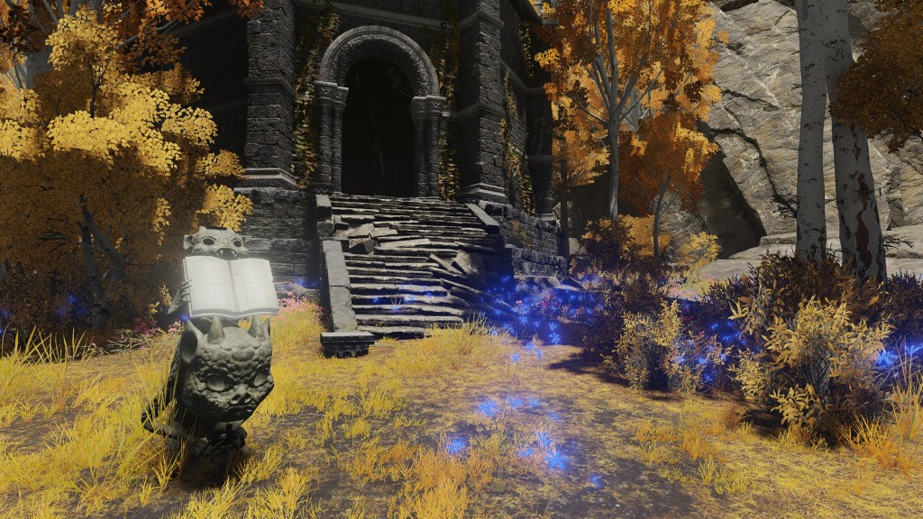 By comparison, the sorcerer tower to the west bears the more obvious eccentricities. Despite housing two witch statues, it too possesses a giant icon of Marika sealing way to the top of the tower. Up there hides the owner’s private archive along with a chest containing an appropriate memory stone. The bottom floor, meanwhile, holds the lion’s share of the sorcerer’s notable collection of glintstone crystals, one of which we can loot from the tables. Add to that the corpse carrying magic greases just outside the tower, possibly the sorcerer in question, and we can presume that it was your standard academy scholar who built the place. And yet, the flowers surrounding the rise are not the expected glowing blue flowers — instead, we are greeted by the same golden flowers growing at the nearby Erdtree. Evidently, this astrologer set out to study the Minor Erdtree, probably in the hopes of incorporating the power of gold into glintstone. In the course of his studies, the man of sorcery discovered religion.