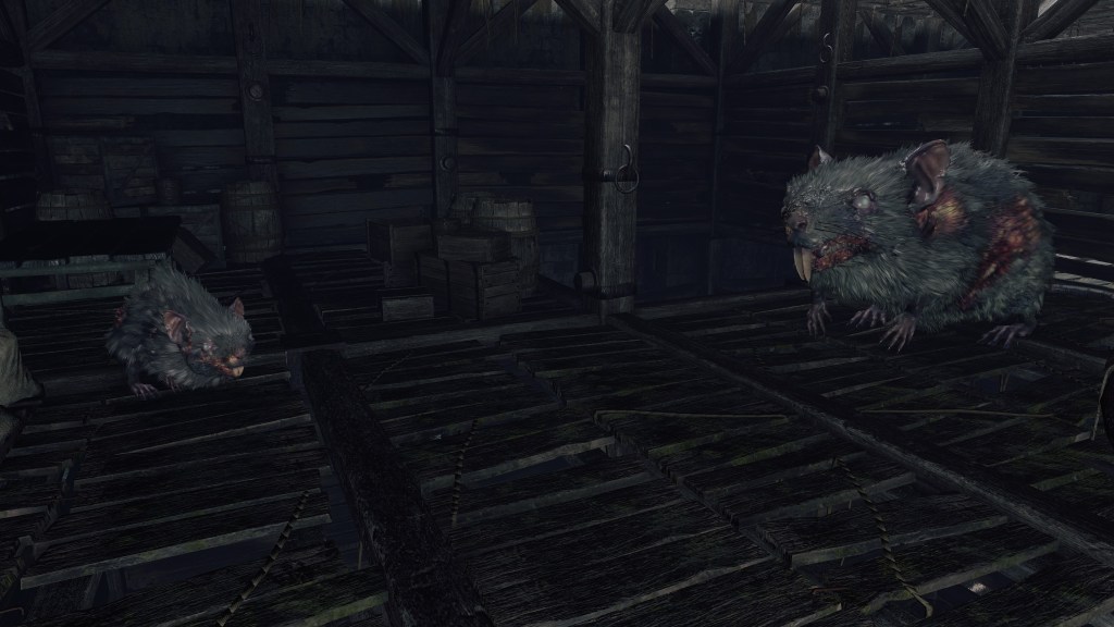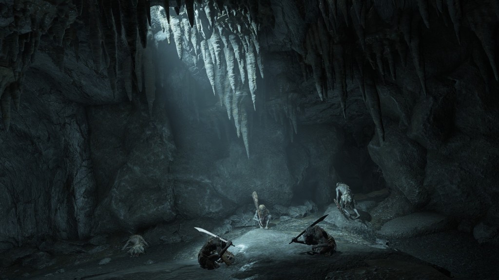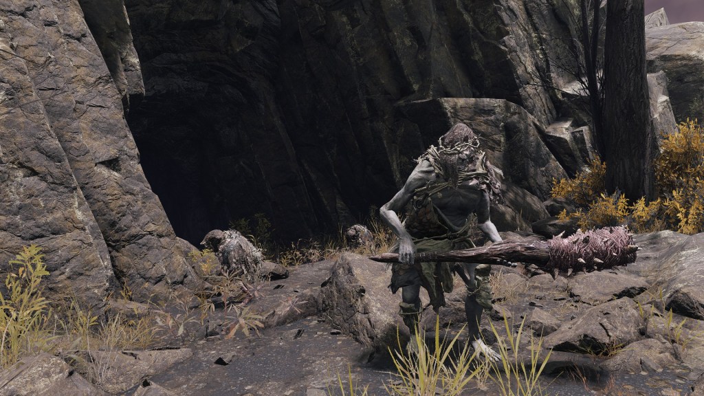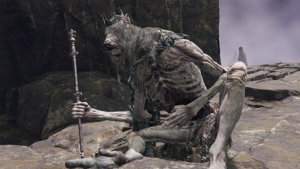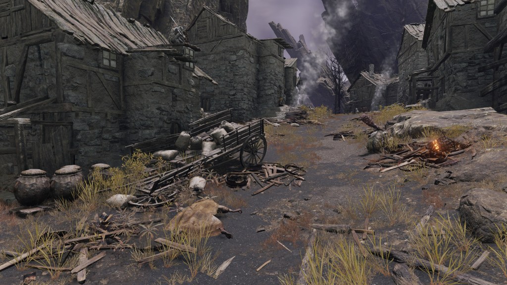 When we arrive, the Hermit Village has just been ransacked, demi-humans crawling all over the area as homes are destroyed and corpses piled up. The abatis confirms that the core settlement did mount a defense, but all for naught. Among the dead include the resident sorcerers, the aforementioned Hierodas equipment actually looted from the bodies of demi-humans. But not all were victims of these savages. One academy sorcerer appears to be teaching a bunch of the tribesmen. Several more loiter around as they attend to Queen Maggie, or Magi (マギ) if their connection wasn’t obvious enough. Evidently, a group of glintstone scholars established contact with a local tribe, providing their brood mother a queen’s staff and memory stone in exchange for leading her kinsmen in raiding the pillage. The apparent motive was to take custody of Azur and pry his secrets, hence leaving him alive and waiting around while he meditates. Whether they were previously villagers themselves or simply chasing a lead on Azur’s whereabouts, they chose to massacre a community for the pursuit of sorcery.