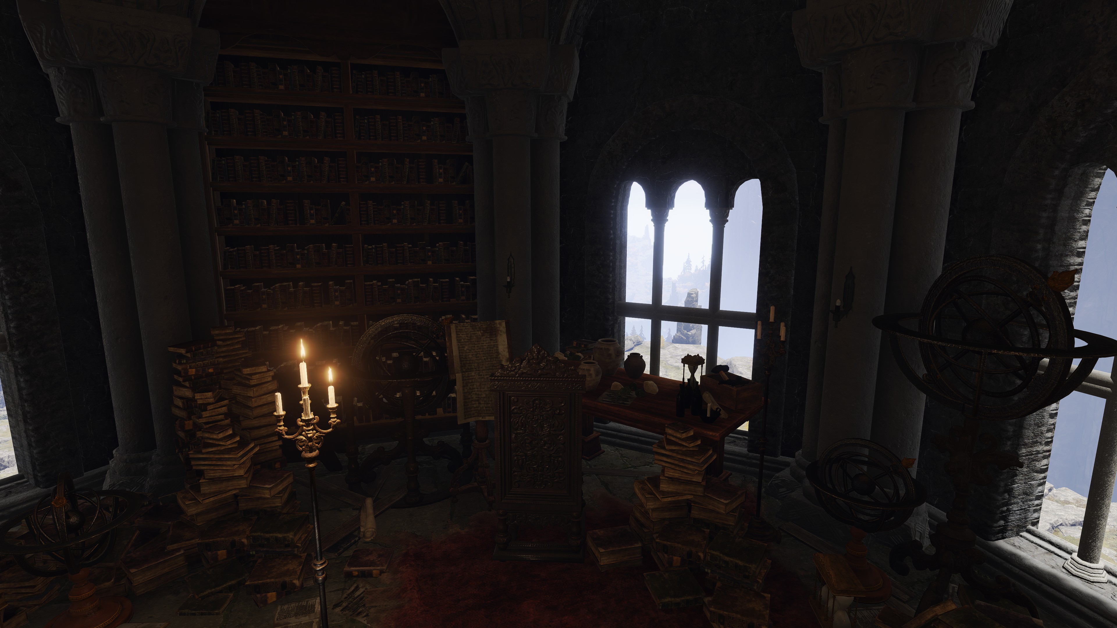 Near the Minor Erdtrees both east and west in Liurnia lie peculiar sorcerer towers. For the one to the east, its proximity to the tree is ancillary. Glowing blue flowers precede the rise, and a chest inside contains the Gavel and Cannon of Haima. The owner’s history at the academy is obvious, this Haima sorcerer since immersed in personal studies. Even compared to other towers, this one is filled with mostly bookshelves plus a great many armillary spheres. Why collect so much reading material to study the stars? Because the goal demanded such depth of knowledge. A graven school emerges from the floor as we climb the tower, the ball of sorcerers presumably sourced from the Black Knife Catacombs below. The Haima scholar wanted to examine the Primeval Current despite Rennala’s ban, so built a tower on the fringe where a person could conduct such research in peace. It is no wonder we find no witch statues inside the rise. For someone who would prefer to ameliorate this divide by force, to be helpless against the heroic queen must have been frustrating.