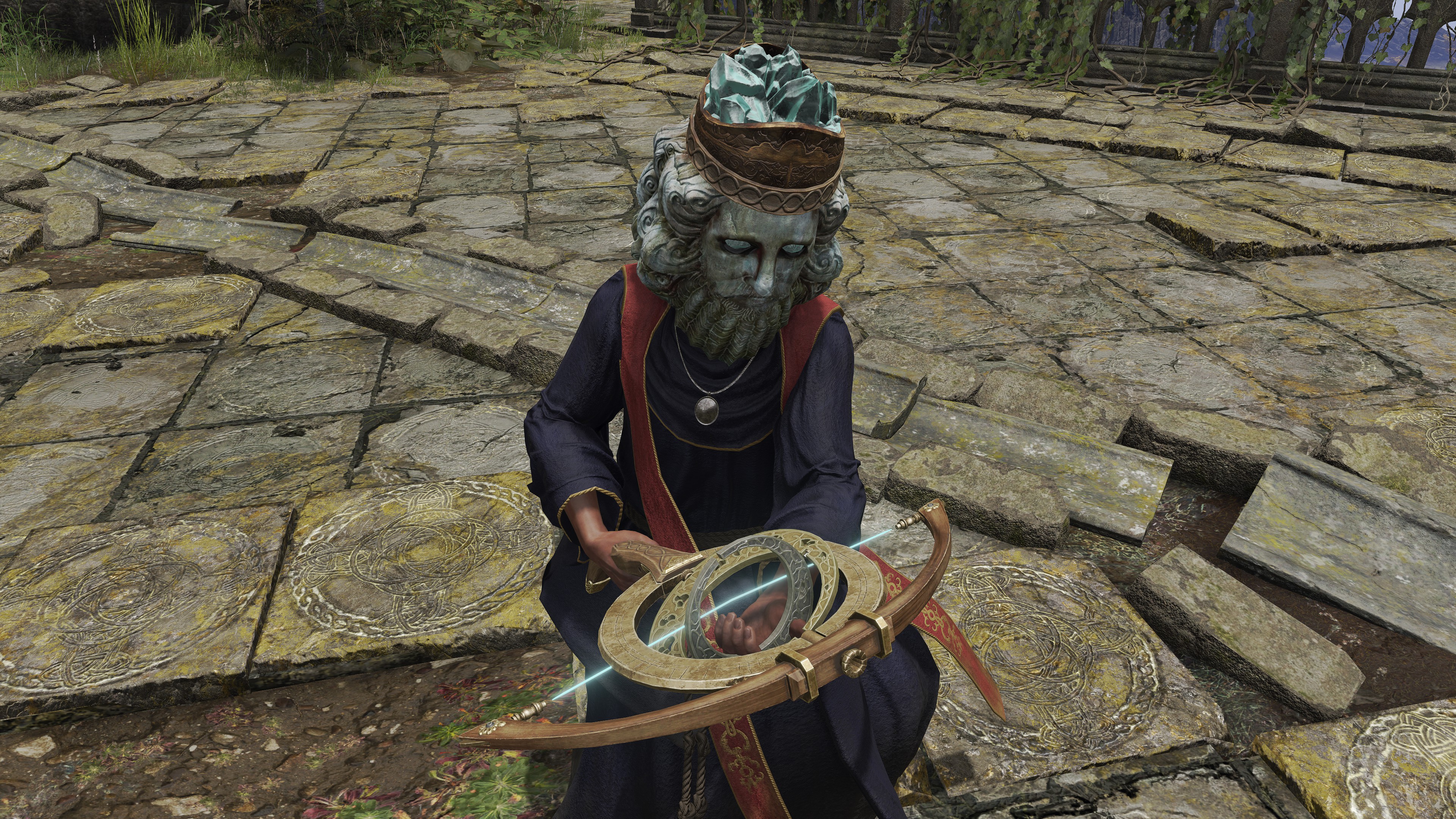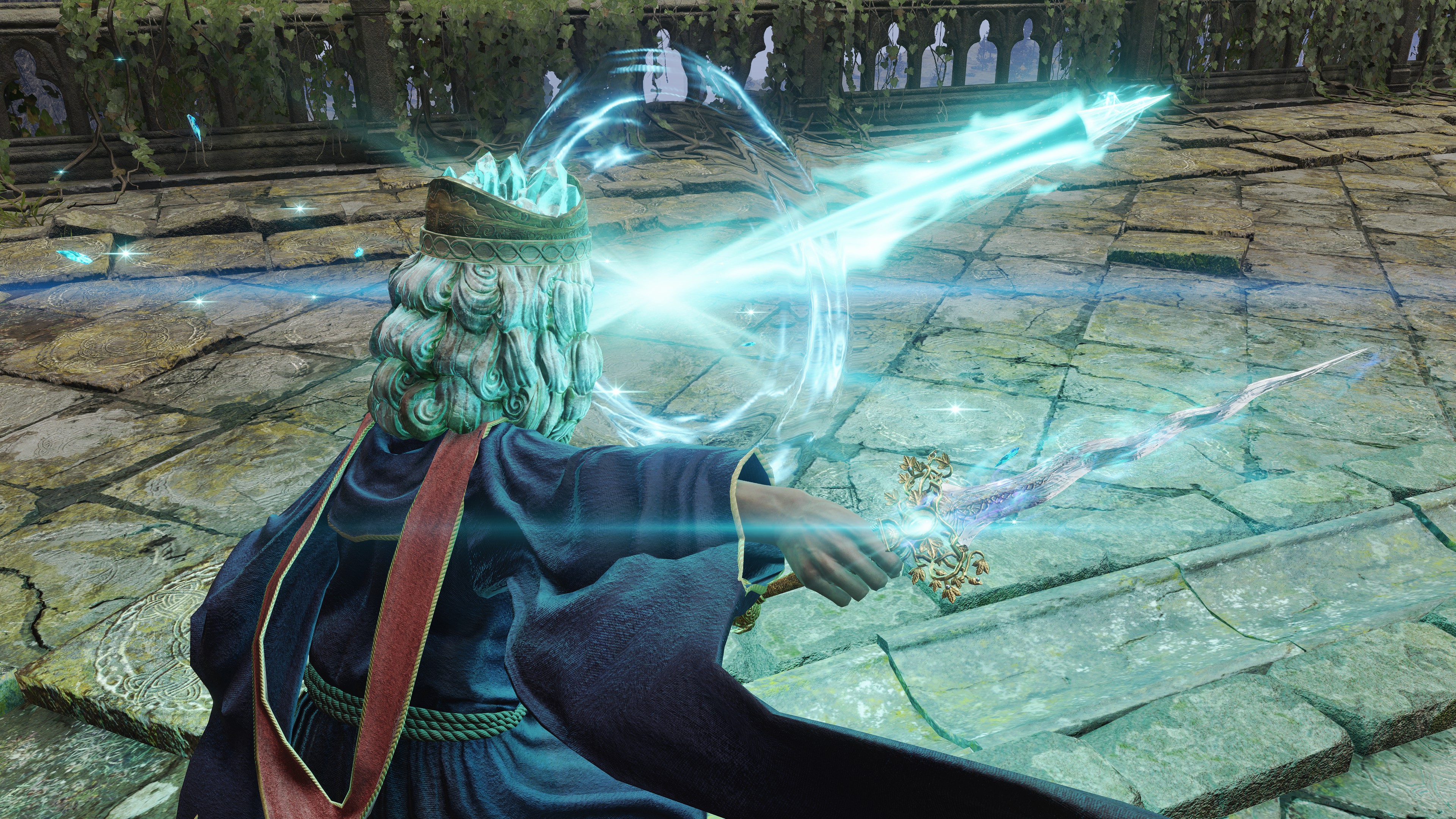 In order to sell the other sorcerers on the matter, the Carians crafted exquisite weapons celebrating the new union, like the Full Moon Crossbow. This crossbow’s name is peculiar in that it uses a different term for “full moon” than the one typically associated with Carians (満月) The kanji in this case more literally means a “moon ring” (月輪) and so can be read instead as a “moon and ring” crossbow, referencing the Full Moon and Elden Ring central to the respective nations’ royalties. The double-meaning is doubly apparent in how the two rings facilitating the bow’s reloading mechanism “dance” — in other words, come together to move in conjunction with one another. The blue “ring” represents the full moon of Raya Lucaria; the gold, the Elden Ring of Leyndell. Together, they synchronize to achieve greater ends. In what? Glinstone sorcery, naturally.