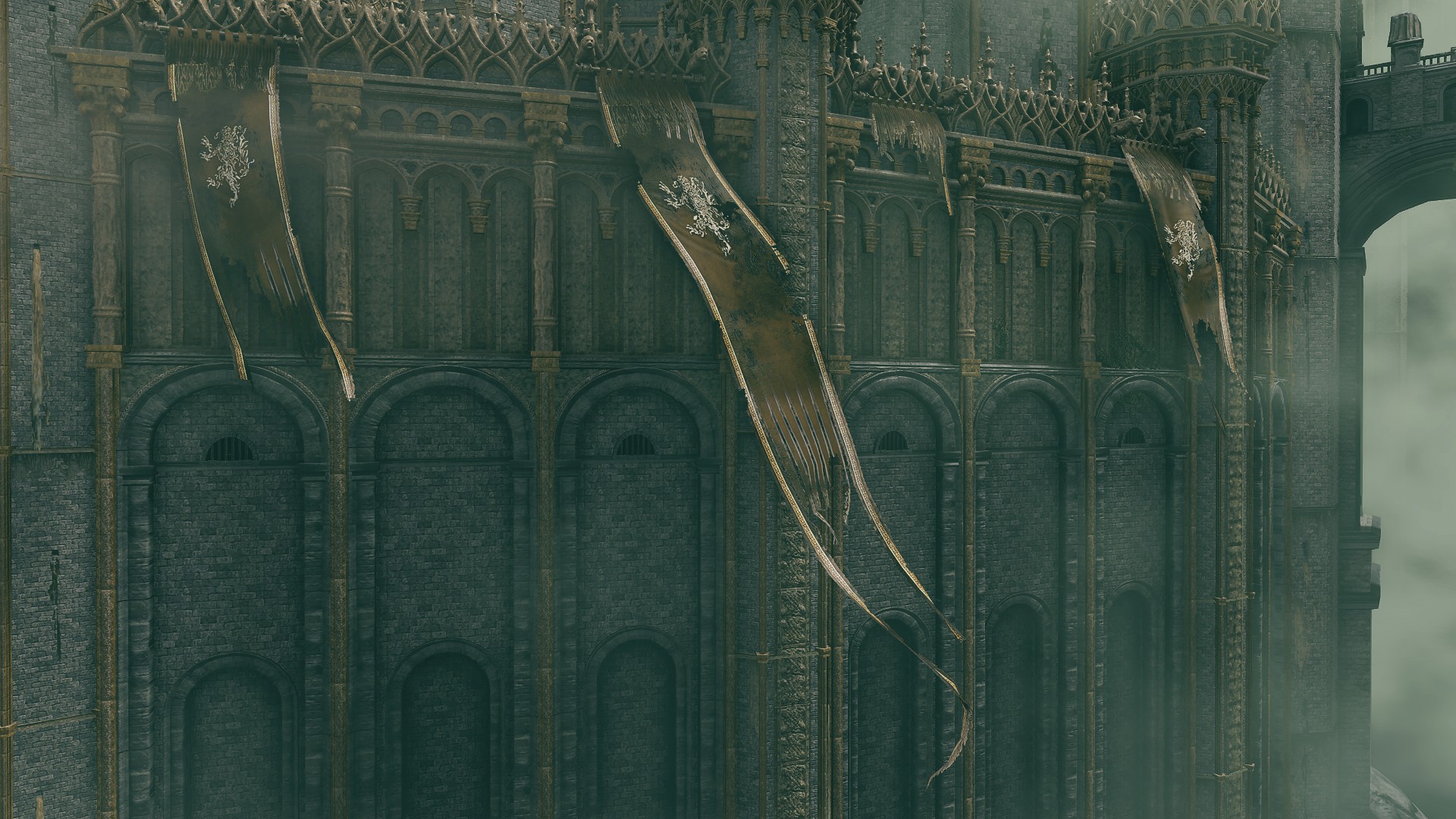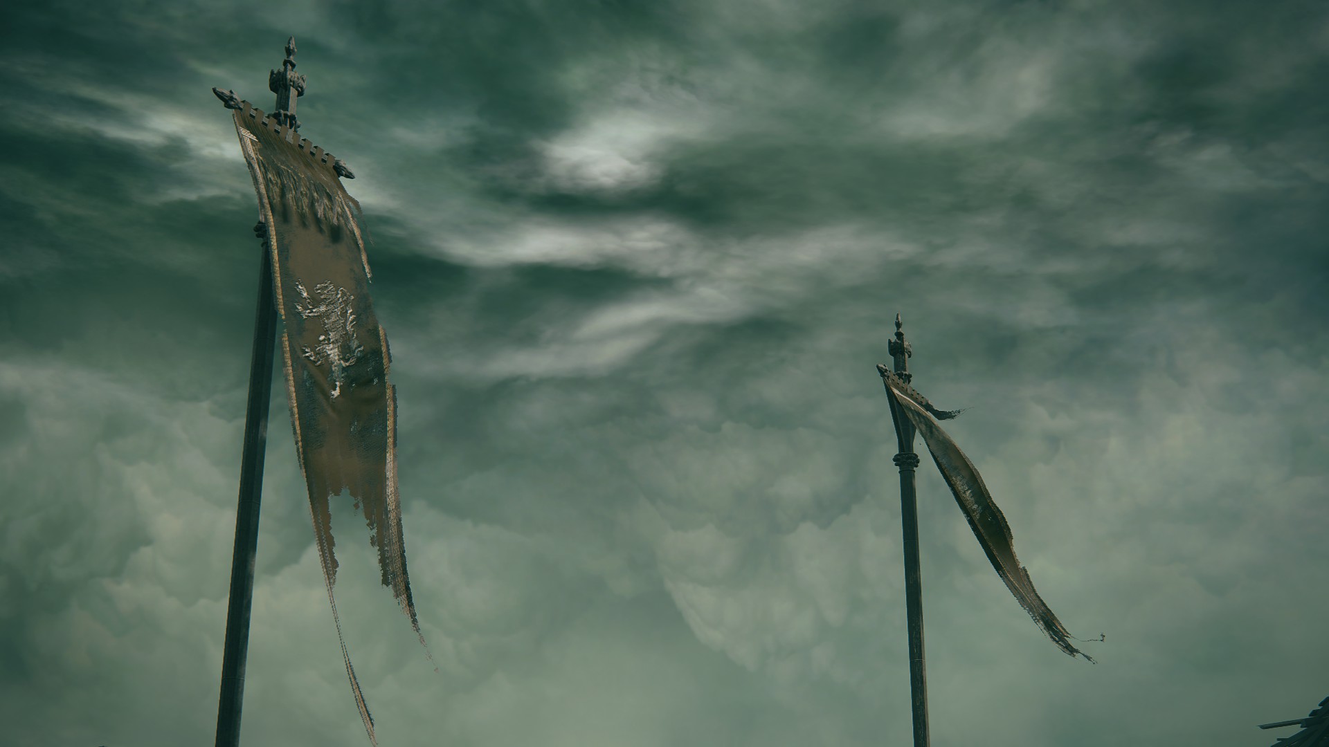 Before the king could return to Limgrave, however, there were still a few loose ends to tie up. Although not to the same extent as Stormveil, Godfrey does seem to have left his mark on Morne before departing, the castle bailey and back yard planted with the same trees seen at its counterpart on Stormhill. Perhaps the Elden Lord was concerned about this relatively large fortification’s isolation from the rest. Entrusting a garrison of appropriate size — mostly pagan or otherwise — with staffing such a place might make any absent ruler nervous; he didn’t want to come all the way back to quell another rebellion south. So, before leaving Morne to its own devices, Godfrey made sure to install a little propaganda as a reminder not to think treason just because they were, literally, on their own little island. Hanging around to import some plants also gave his wife time to finish her own business.
