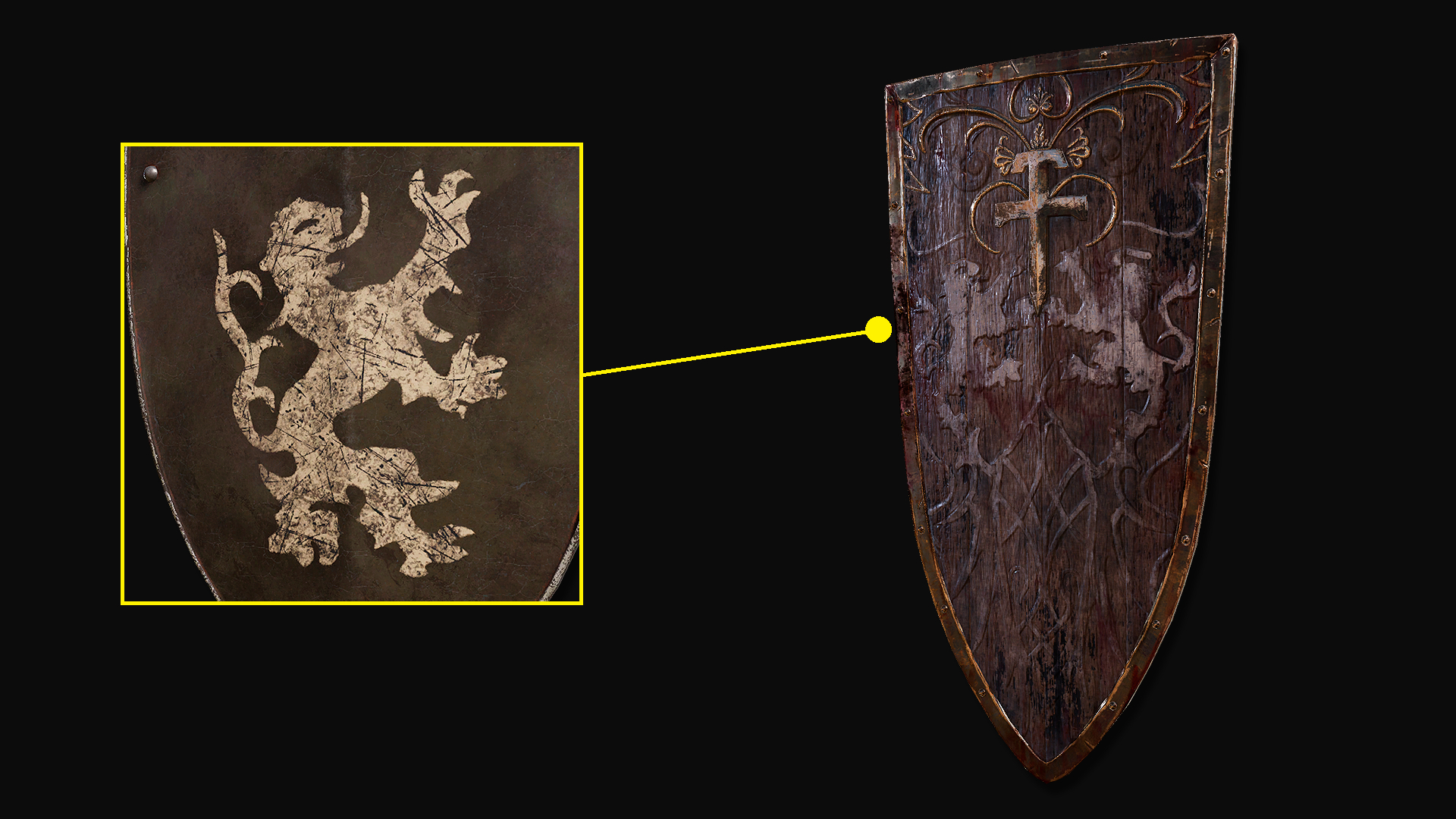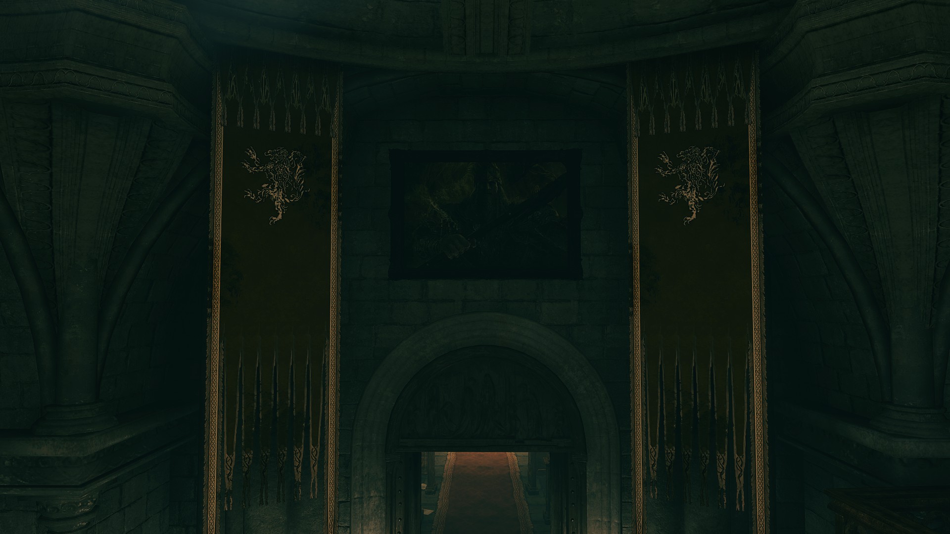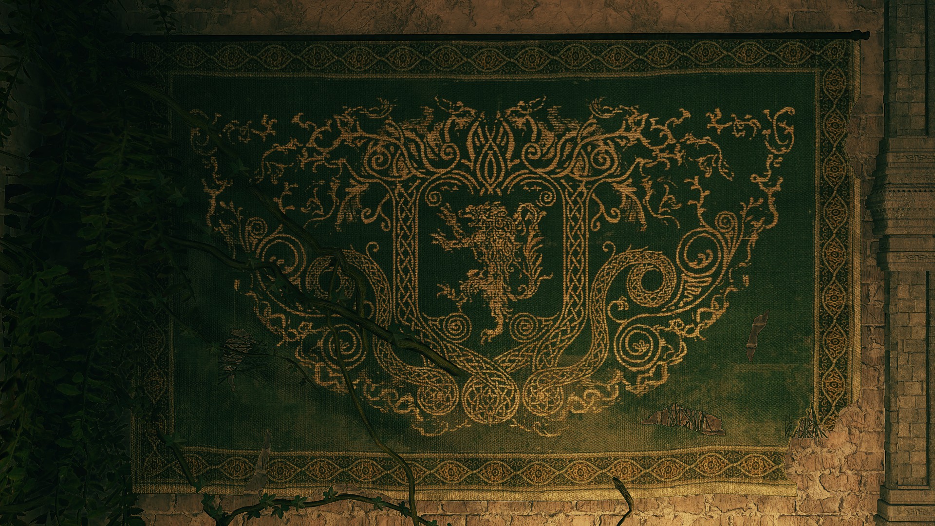 The message is clear: there is a new king in town, and he had the strength to ensure that never changed. No one would think of rebelling again so long as Godfrey still lived, and he made sure none of them could forget it. The Warlord’s portrait hangs above the entryway to the main chapel of the castle church. Another, far larger, painting hangs in the dining hall — though the concept art used depicts his axe broken, which doesn’t occur until after he left the Lands Between in the Long March. Regardless of any anachronism, these paintings make it impossible to attend mass or eat a meal without being reminded of the Elden Lord. Furthermore, a corpse in Stormveil possesses the Wooden Greatshield depicting a sword flanked by two leonine beasts, Godfrey’s symbol. In fact, green banners featuring his beast crest hang everywhere, including from the wall; those in particular held up by golden beast grotesques.
