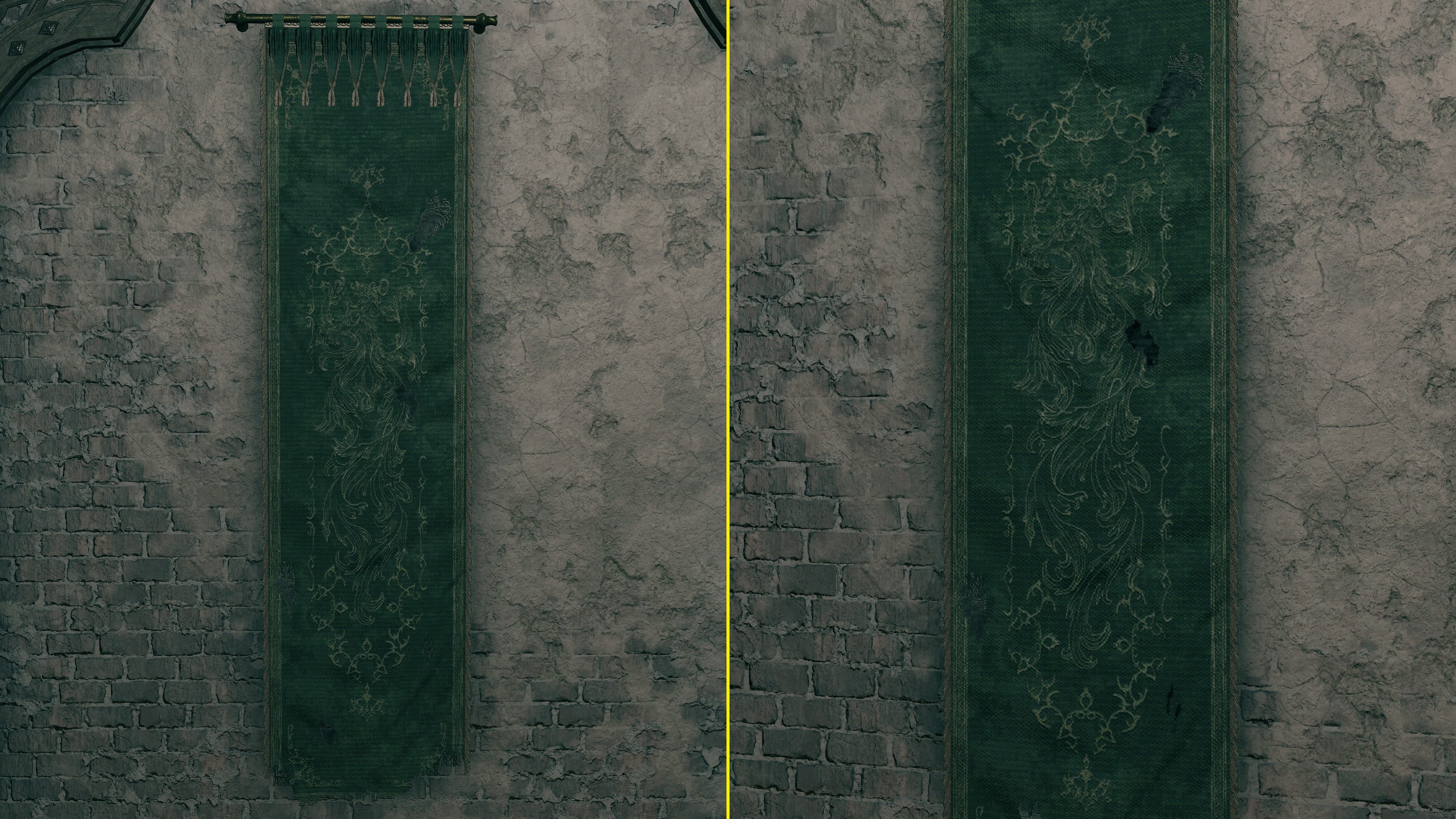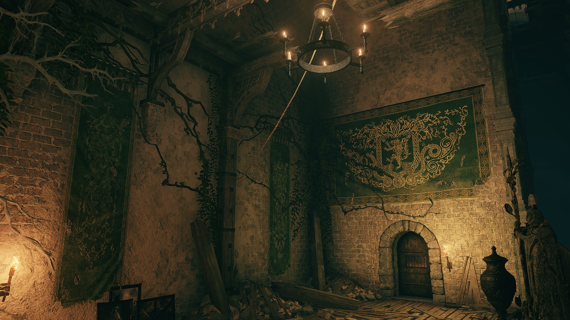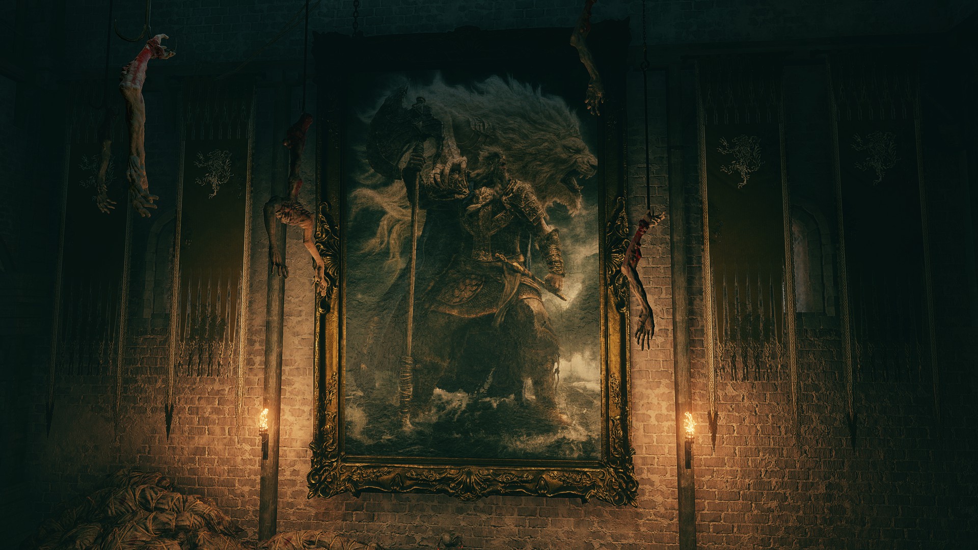 The message is clear: there is a new king in town, and he had the strength to ensure that never changed. No one would think of rebelling again so long as Godfrey still lived, and he made sure none of them could forget it. The Warlord’s portrait hangs above the entryway to the main chapel of the castle church. Another, far larger, painting hangs in the dining hall — though the concept art used depicts his axe broken, which doesn’t occur until after he left the Lands Between in the Long March. Regardless of any anachronism, these paintings make it impossible to attend mass or eat a meal without being reminded of the Elden Lord. Furthermore, a corpse in Stormveil possesses the Wooden Greatshield depicting a sword flanked by two leonine beasts, Godfrey’s symbol. In fact, green banners featuring his beast crest hang everywhere, including from the wall; those in particular held up by golden beast grotesques.