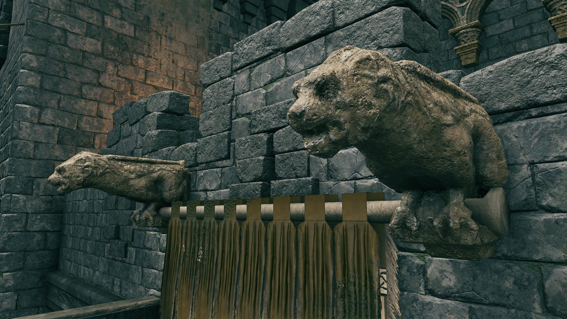 Before we can even approach Godfrey’s tower, we must pass through one last gate on the main path. This entrance bombards visitors with much of the same imagery to come; sentinel statues flank the sides, lion reliefs adorn the walls, and female grotesques pour their vessels overhead — or would if, like the grotesques of the castle chapel, their figures hadn’t broken from prolonged weathering in the storm. However, there is one curious detail above the gateway itself: a line of sage statues, similarly lost to the elements. The choice of icon over the saint variant gives the impression of wanting a dialogue. While that might sound odd given the show of strength just beyond this corridor, the idea seems to be more the carrot-and-stick approach. The same hawk figure paired with the Erdtree above the inner main gate hangs just beneath these sages. This suggests a willingness to accommodate the penal colonists.
