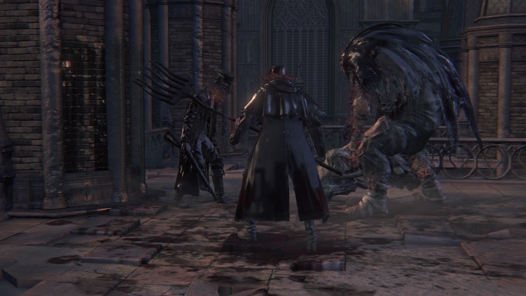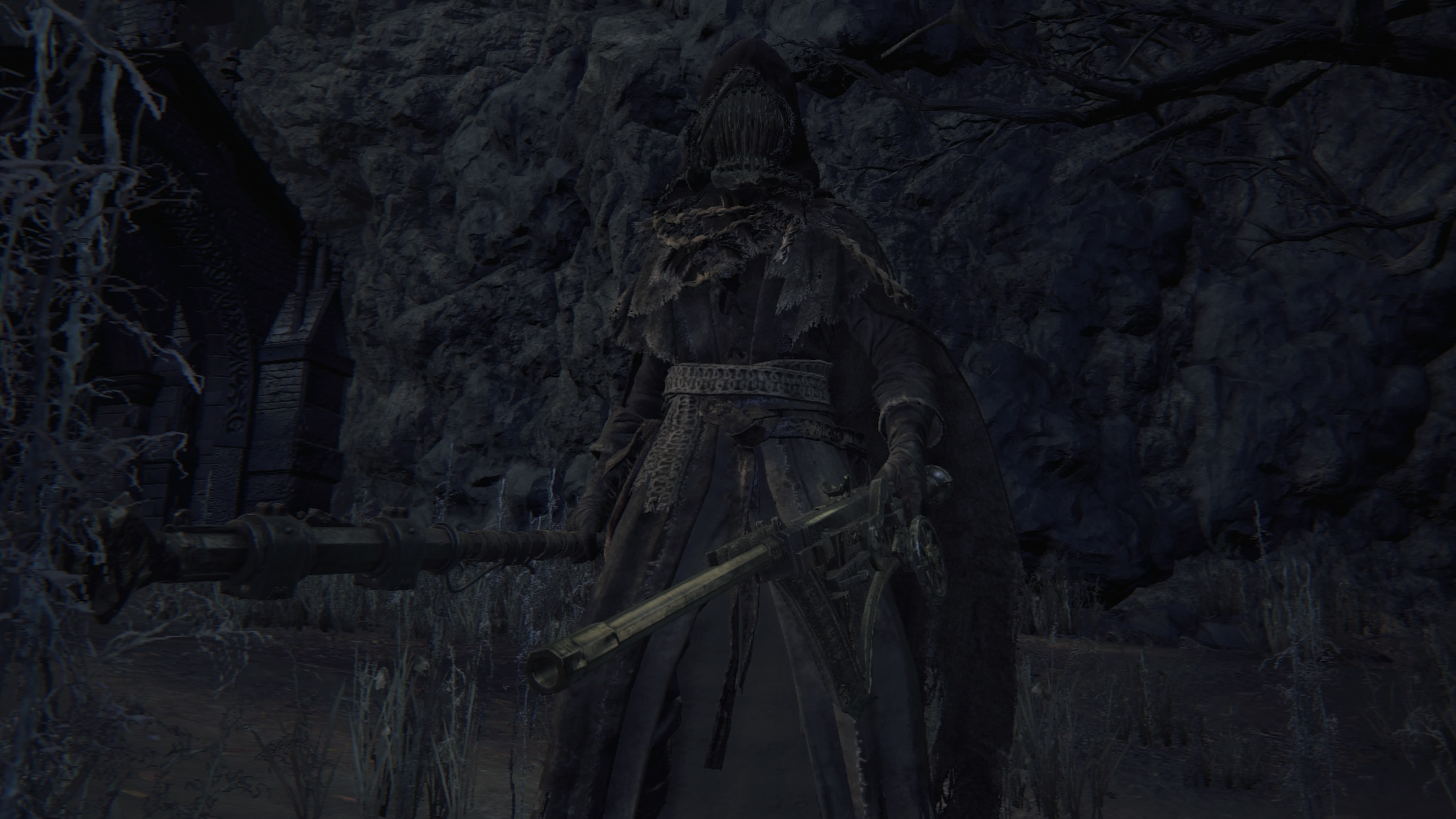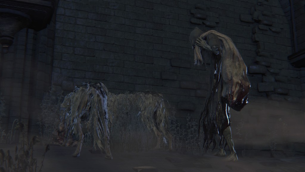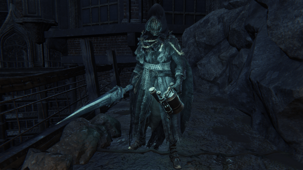 Two Yahar’gul hunters are stationed guard at the border between the Grand Cathedral and the hidden old church to Yahar’gul. One loves long range, wielding both Ludwig’s Rifle and the Rifle Spear, while the other enjoys melee, armed with a wooden shield and Tonitrus. These total opposites complement each other well in their shared duty, and this isn’t the last time. We encounter three more in the Yahar’gul church proper after the red moon appears, with just as much diversity between them. The first wields a Tiny Tonitrus along with the threaded cane and flamesprayer, evidently concerned with maintaining his humanity purged of crude beastliness — the reason can be surmised from the skull of madman’s knowledge looted from his corpse. The second has a fetish for heavy firepower, utilizing the Rifle Spear along with the cumbersome cannon. The last has all but fully embraced the beast; stripped down to his skivvies, we can only identify his affiliation thanks to keeping the iron helm, otherwise relying on a beast claw and Clawmark rune inviting him to keep tearing into that warm blood.