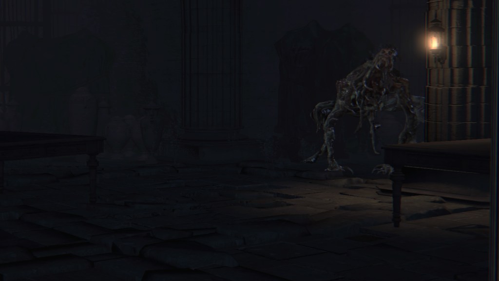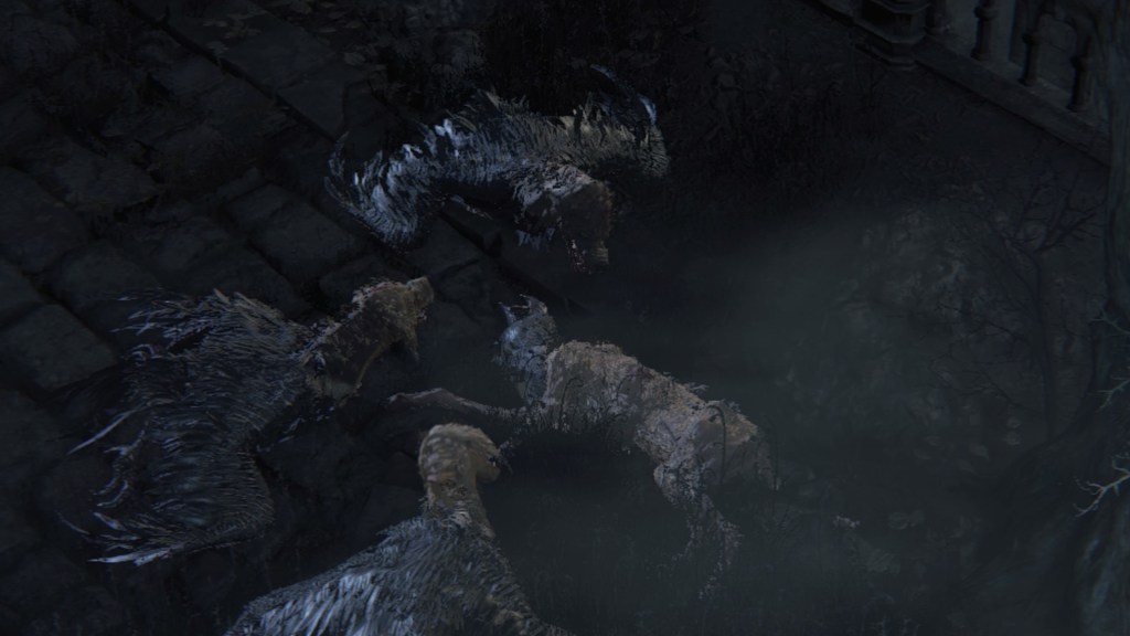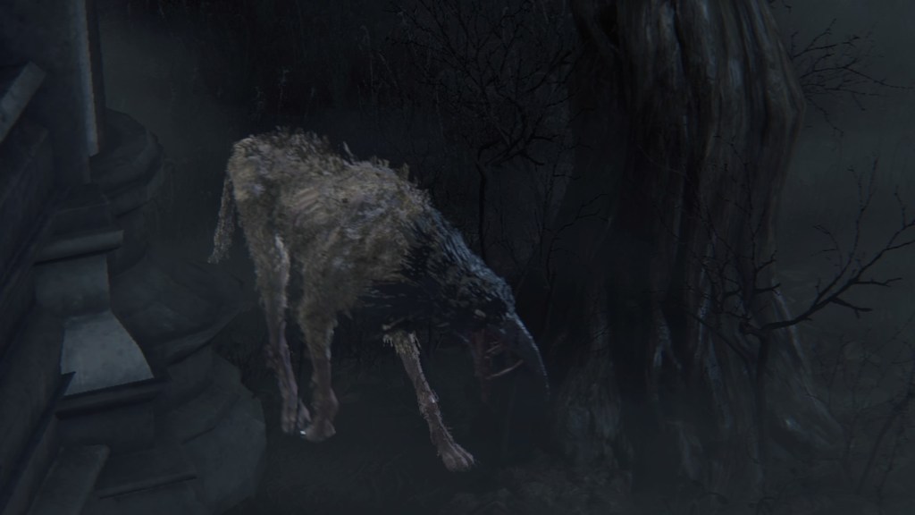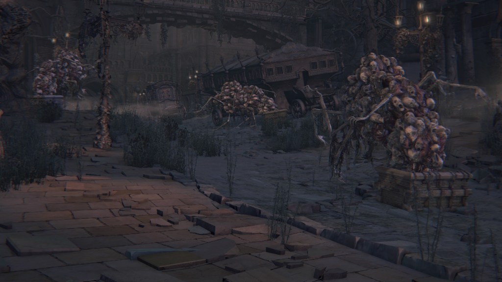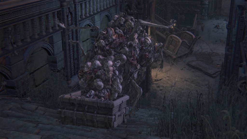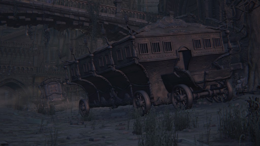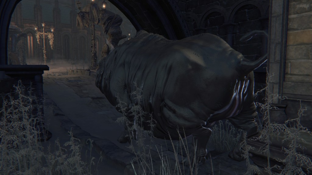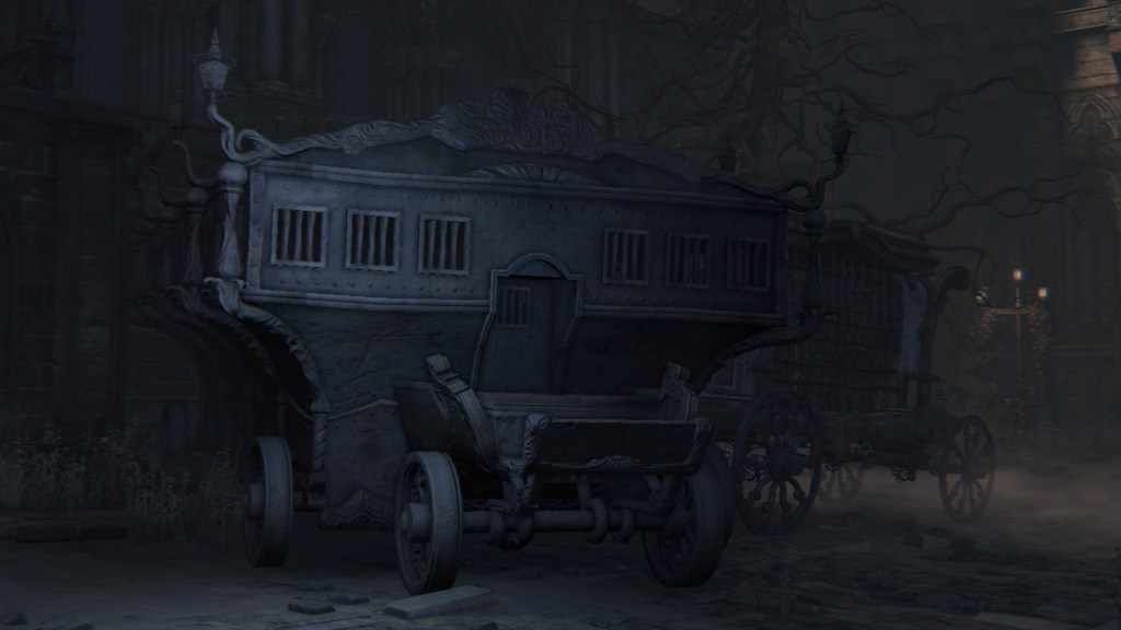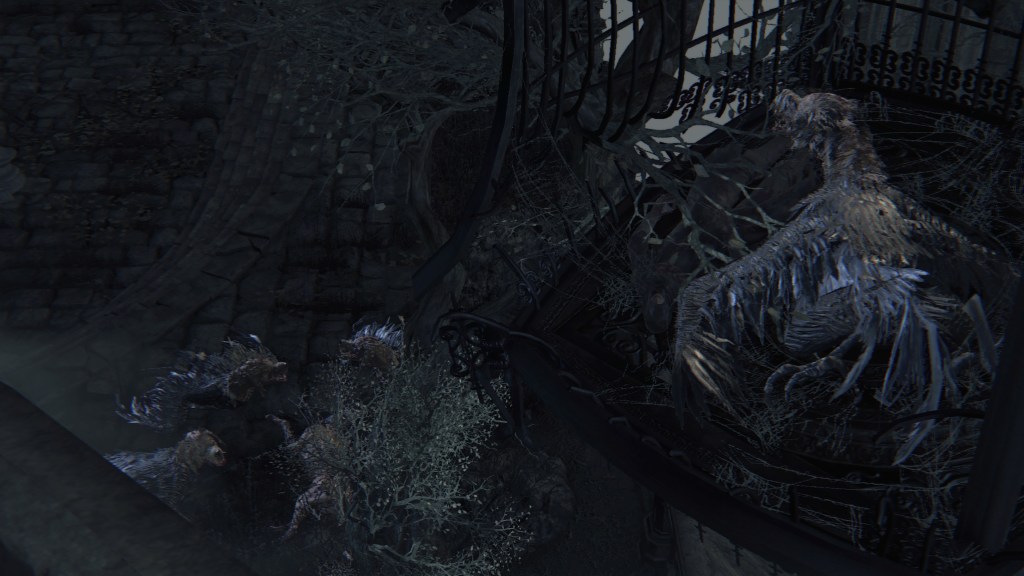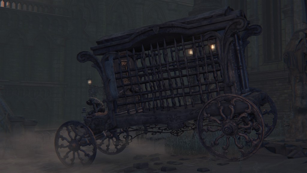 Exploring Yahar’gul before the red moon, we come across two ordinary maneater pigs: one coming up the slope from a burst-apart cage wagon, another lurking in the alley across from a similarly broken wagon. These wild beasts were brought into town like circus animals, only to break free of their confines. They weren’t alone, since the same wagons fill the streets. One in particular still has its dead driver, a Yahar’gul hunter judging by his armor. Perhaps the Mensis stooges were bringing in human captives by the cartload. However, it is plain that their task has been to capture more than just bipedal test subjects. They might have even searched closer to home, as there is a suspicious lack of crows fattened on the city’s endless supply of carrion in town. The only dogs are likewise the kidnappers’ own breed, not the ones seen in the Nightmare or the rest of Yharnam — and hunters stop needing a hunting dog once beasts are no longer their prey. Factored together, Yahar’gul has probably been supplying Mensis with all these animals for experiments on top of their regular haul.