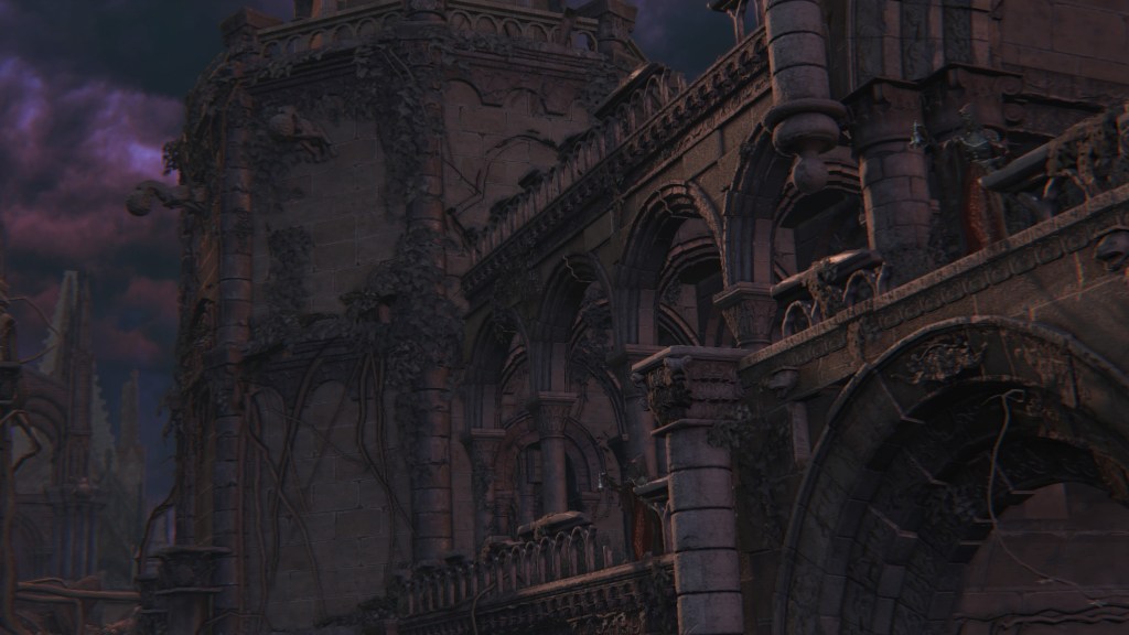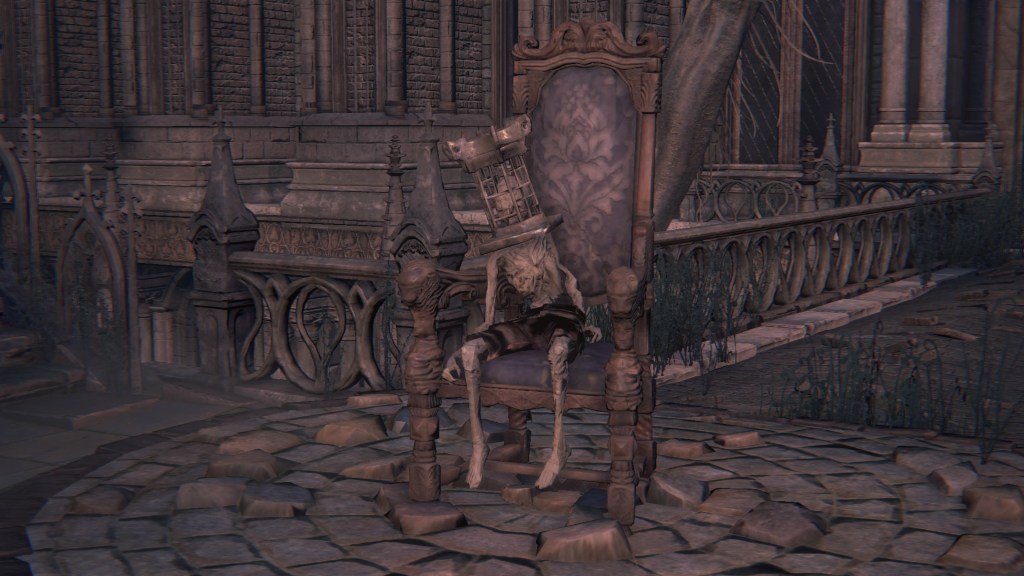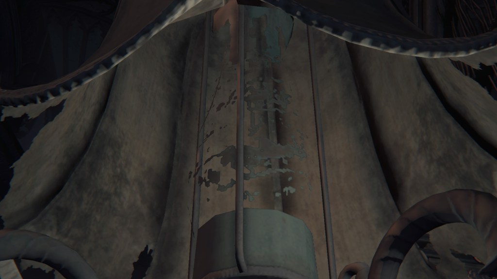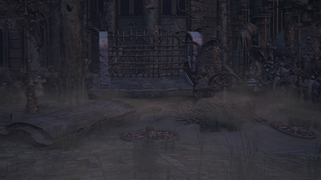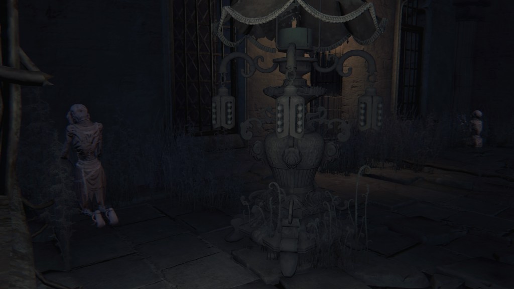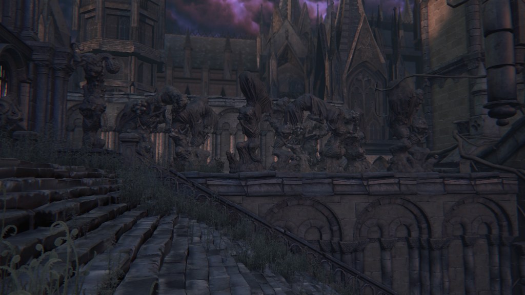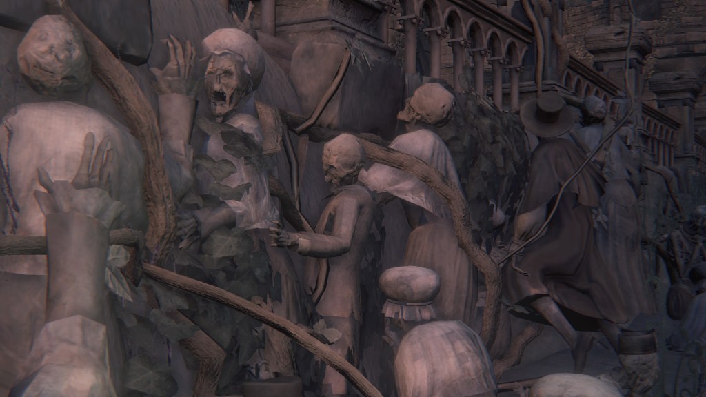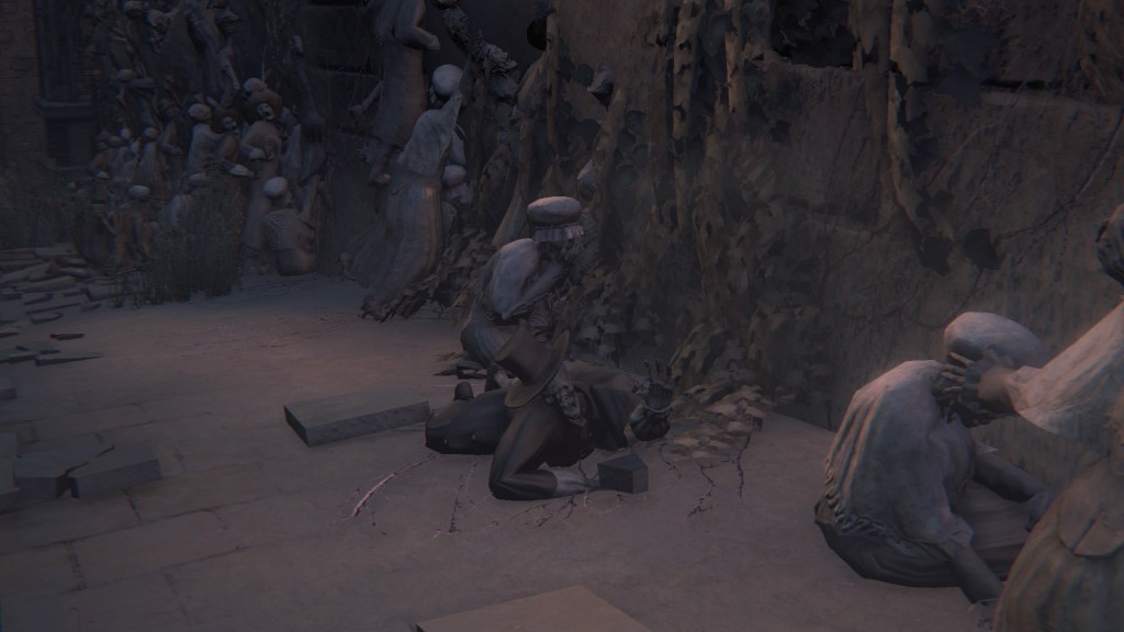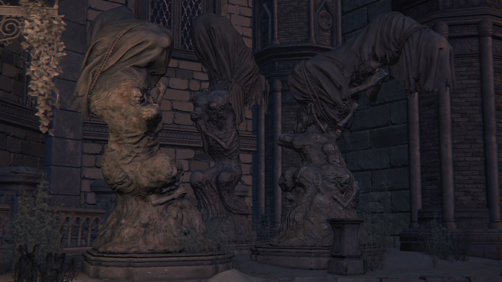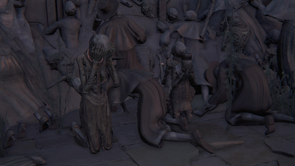 As we progress deeper into Yahar’gul, we pass throngs of petrified people, presumably the otherwise absent citizenry. Curious then that the common folk dress no different from the rest of Yharnam — the men, in fact, more resemble Willem’s manservant. Even with the local church limiting contact with outsiders, their fashion trends still bled into the culture. Only the clergy wear raggedy robes and traditional dresses reflective of their Pthumerian roots. Their old iron armor has likewise become relics for hunters to swipe. Yahar’gul was changing with the times. Indeed, fashion trends seem to coincide with a broader drift in devotion. The church’s street pulpit complex looks long neglected compared to surrounding infrastructure. The state of disrepair speaks volumes about the laity in modern Yahar’gul society: they don’t care to hear the clergy’s message. Ironically, the overbearing religious authority made the flock simply tune out the supernatural, leaving satellite facilities to become rundown as it lost effect and support.