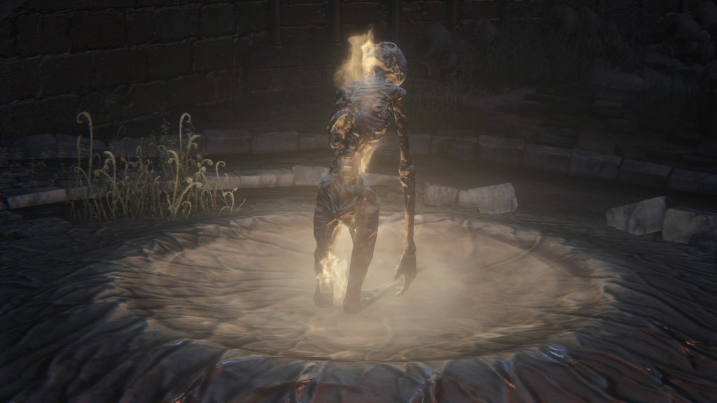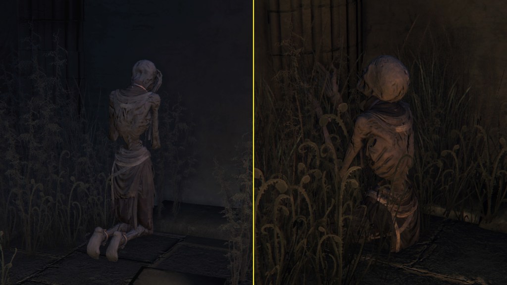 These subjects we see put in chairs wearing the Mensis Cage, obviously to test run Great One correspondence — much like the Choir member who attempted to make contact on the Orphanage balcony, their bodies have mummified. Whether because one person’s mind simply lacks the capacity to withstand direct connection with a Great One or otherwise, the energy overload consistently caused a backlash, frying the subject. It may not have always been fatal, since we do see more mummified prisoners on their knees in despair within their cells; admittedly, this assumes that FromSoftware isn’t just reusing assets. But without an infant Great One, they were unlikely to see results. Mensis did try reaching out with human children, most notable example found beneath the Amygdala statue in the church chancel. Clearly, the gods would only be receptive to one of their own kind.