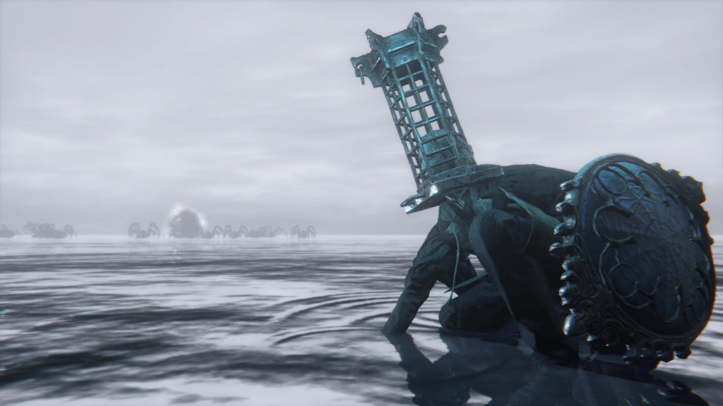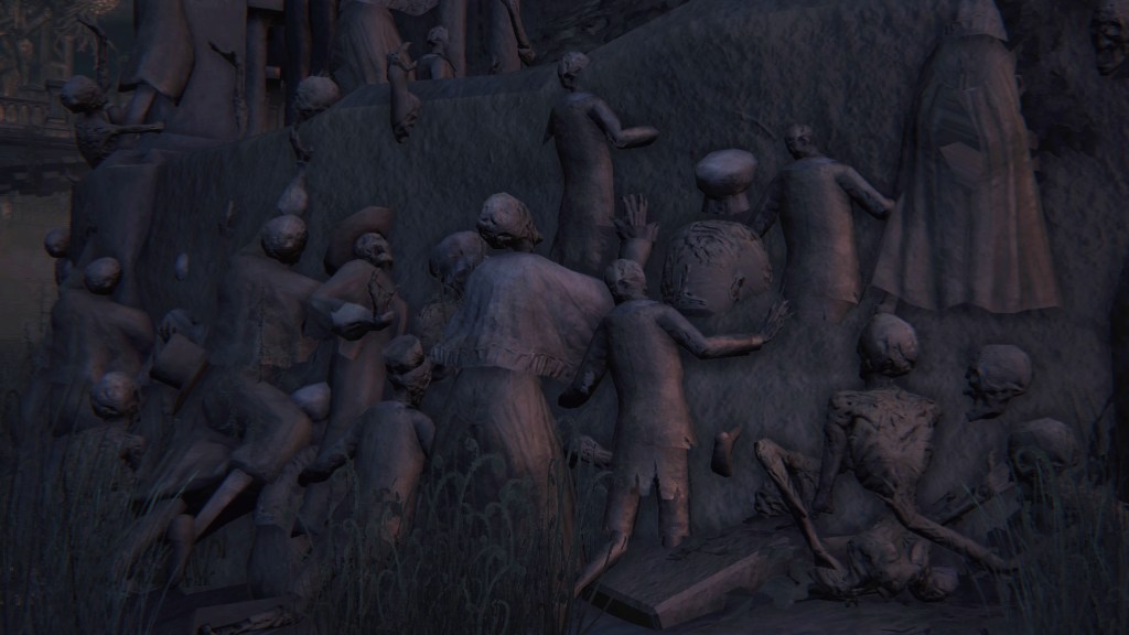 In short, every innocent in Yahar’gul at the time unwillingly contributed their life and energy to help power that “signal” sent out to the Great Ones. This is why we acquire Arcane Lake from a citizen’s corpse among the petrified — they were all sacrificed to connect Micolash to that proverbial lake in mud. We can see this reflected in statues on the streets and around the church facilities. A strange confluence of bodies shaped like a grotesque Tower of Babel, their multiple sets of arms clasped in prayer as they attempt to reach god. Such an icon perfectly encapsulates the School’s intentions with this ritual and indicates that they had been preparing for it for quite a while when the plan was finally executed. According to their theory, Mensis just needed to achieve contact once to uplift the whole of humanity. Weighing that against the lives of one meager — and unfaithful — populace, it is no mystery why they were sacrificed to secure Micolash’s connection to the cosmos.