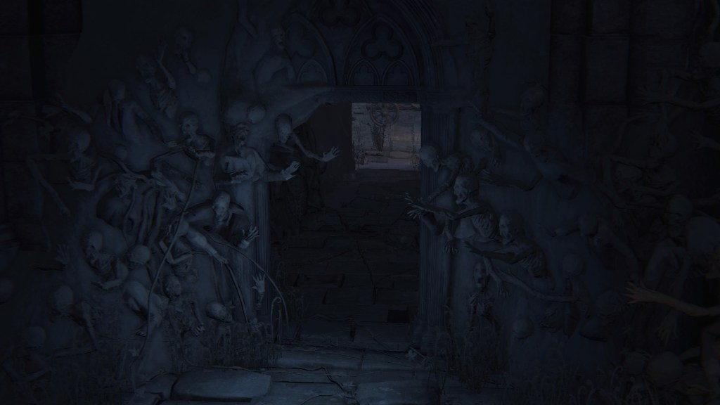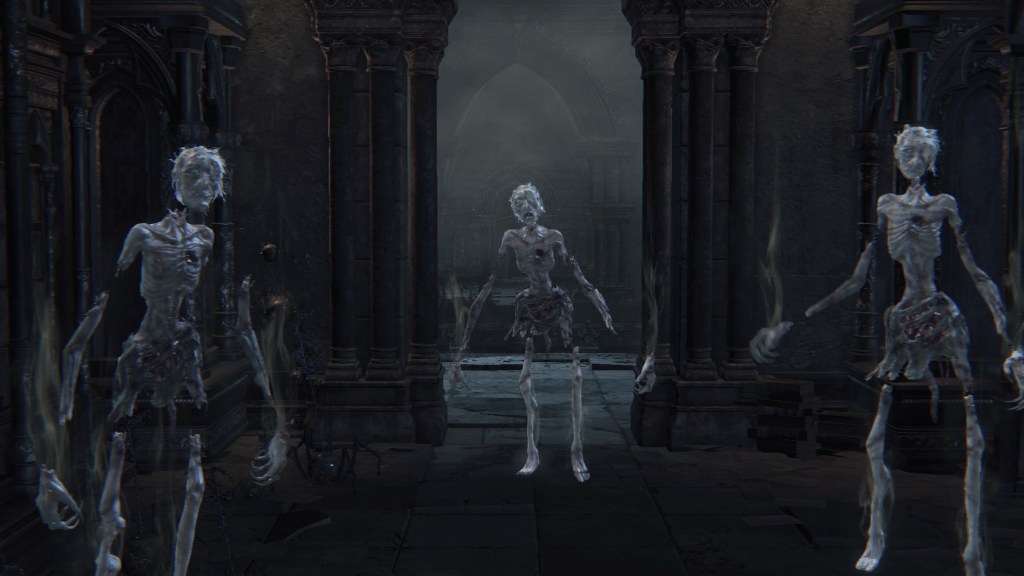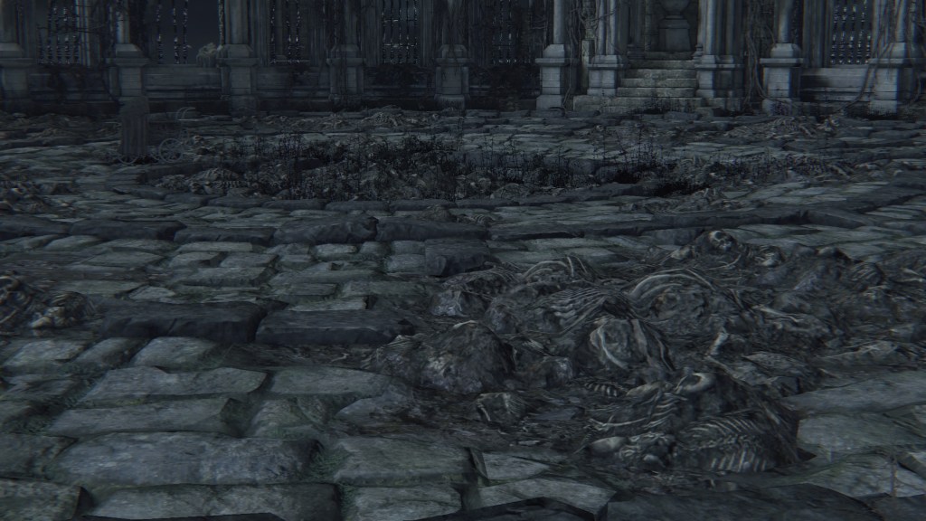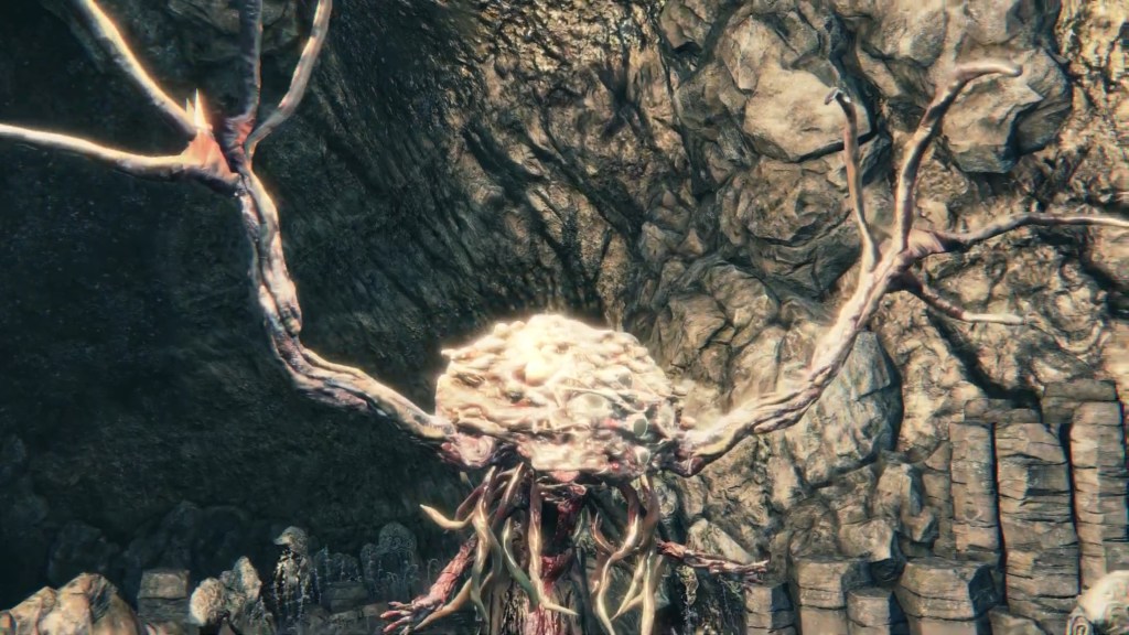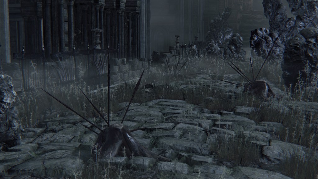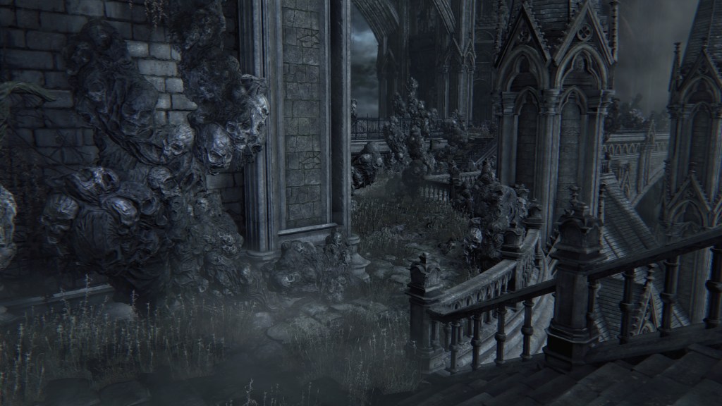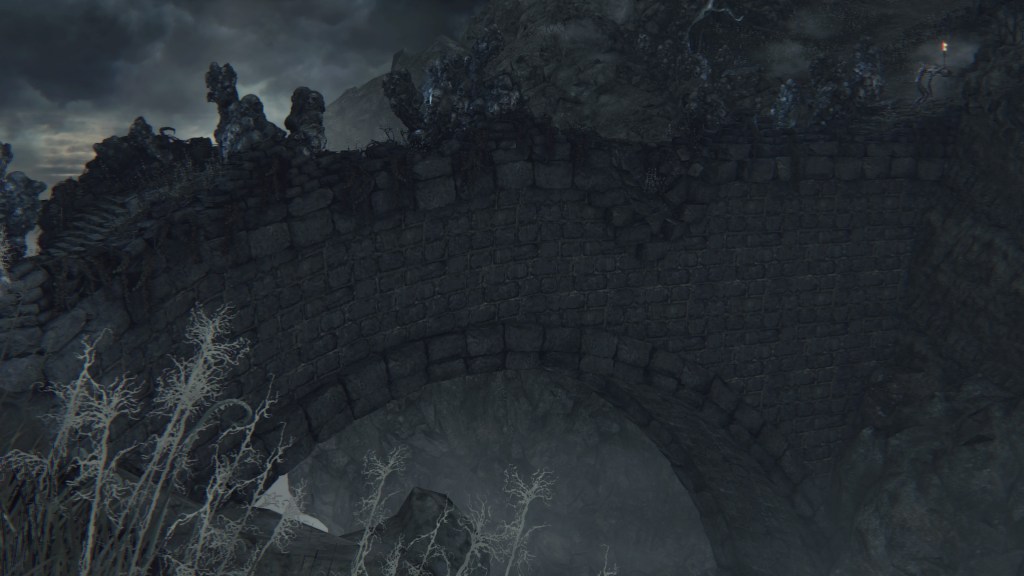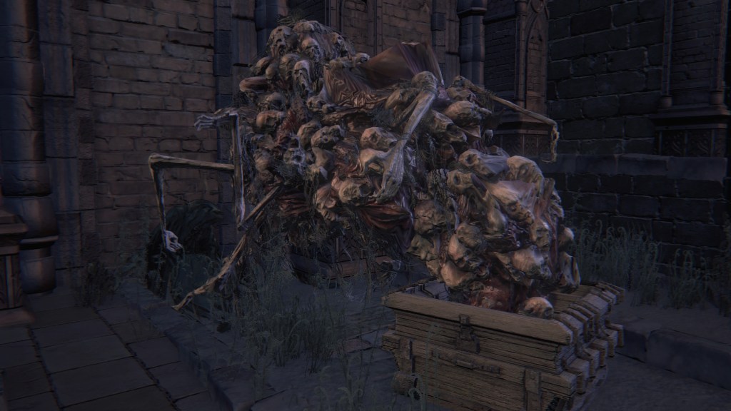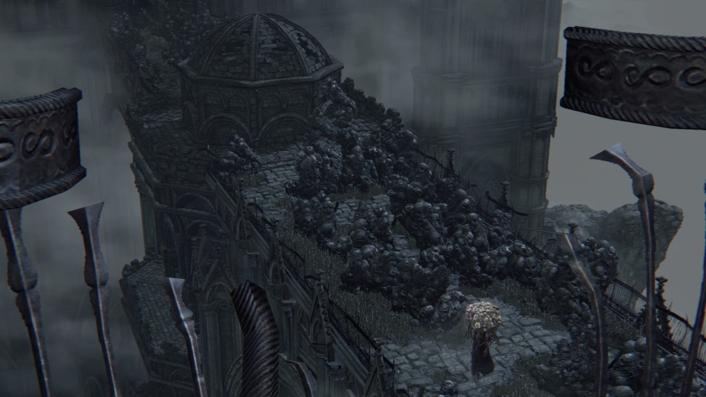 But little did they know, the Brain was totally defective. Being made of corpses, it comes as no surprise that the Great One is rotten. Other than explaining its mostly passive behavior for an enlightened mind, this decaying state has negatively affected its other faculties. Its eyeballs are a kind of “evil eye” that glow with hostility upon spotting a person. Once the Brain spies humans from its tower, it begins assaulting them with shadowy spears which amplify the madness its gaze already brings. Anyone who approaches the Nightmare churches risks death before they can even cross the stone bridge leading to the chapel. A number we see have already suffered that fate. And like the river of blood in the Hunter’s Nightmare, the deep resentment of countless visitors caught unaware have manifested pillars of stone faces everywhere within its field of vision. Even allies are not spared, as the middle great bridge on the Brain’s level is flooded with the same pillars along with bone piles. It is no wonder that the door to that bridge from the second church is locked. Mensis couldn’t afford to carelessly lose any more members.