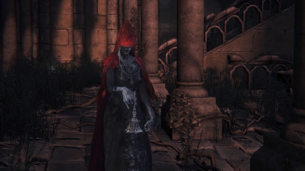 As one of the few survivors still sane, Damian appears to be one such disillusioned student. Now that he has joined up with Laurence’s supposed successors, the codger has made it his mission to snip Willem’s ideological lineage in the bud. Chiefly, this has concerned hunting the Great One driving Byrgenwerth and the Choir’s obsession with kin. The Mensis hunter can be summoned to help battle Ebrietas at the Upper Cathedral Ward’s secret altar — his sign is even present for fighting the Star Maiden in the Isz dungeon, before she had come above ground. Evidently, Damian has been pursuing Willem’s long-sought “phantom” for quite a while. He can likewise help defeat Yurie and Rom as they inhibit Mensis’ plans at Byrgenwerth, so this is part of a general opposition to all things aligned with Willem. For so long, he lived up to his Greek name meaning “subdue”, suppressing vulgar beasts and blood from his work. But after extensive research, he just wants to keep anyone else from chasing ghosts, wasting their life as he did.