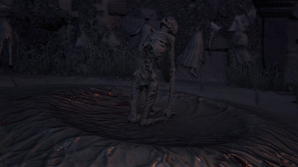 As we can experience firsthand, the abductions have persisted. The aforesaid experiments required more subjects to be delivered, and the carriages on the road to Advent Plaza show how Yahar’gul facilitated that. However, the hidden town cannot be shuffling all these prisoners over to the Nightmare. Adella heard her fellow captives’ distant wails after witnessing them get taken away, suggesting that there are horrific ceremonies being performed with them there in town. Although we are unable to come across these experiments during our prison escape, we do witness some of the results following the red moon. Certain mummified bodies appear kneeling in the streets, contorted back in a pool of glowing liquid setting them aflame. The liquid dissipates as more flesh is burned, and the waxy crater containing it is the same underneath the church’s warp basins. Perhaps the clerics were testing the limits of cross-planar movement without an apparatus. Regardless, this horrific display is just one example of their work this night, and it is barely a sideshow.