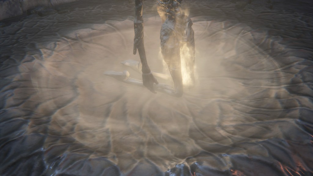 All of this culminates with the creation of the One Reborn in Advent Plaza. This is where “Reborn Plaza” (再誕の広場) gets its name, special bell ringers in red spawning the reborn one (再誕者) from a shadowy cosmic mass above the square right before our eyes. The name and appearance betray the boss as another collection of cadavers, one body still retaining its wooden collar as a former prisoner. And despite the rickety look, the reconstituted entity is powerful. The bare flesh is surprisingly resistant to the arcane, dripping with mucilage it occasionally vomits to deal arcane damage. The boss can also conjure similar dark clouds in arcane arts — in particular, the upper body stemming prominently from its “shoulders” likes to rain down more body parts or generate explosive balls of energy to fire. Its only major weakness is electric bolts, presumably because shocks to the various nervous systems disrupt the arcane power barely holding everything together. If not for its grotesque appearance, one might mistake it for a higher being, and that is very much the intention.