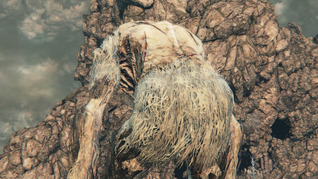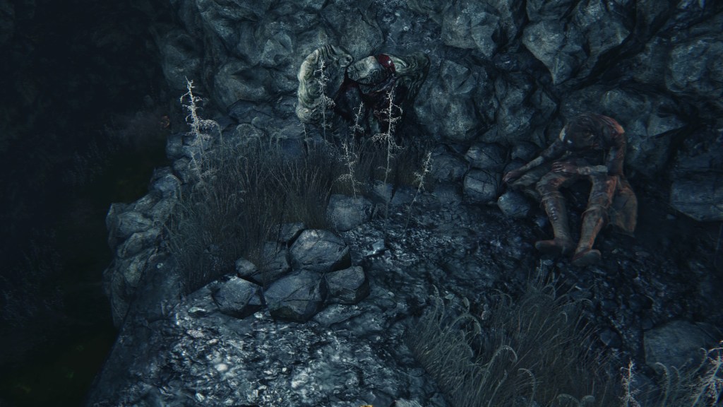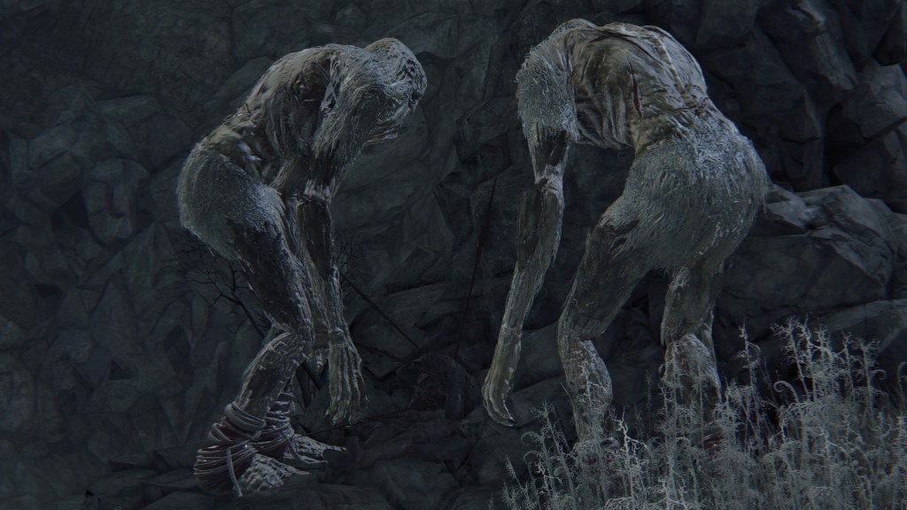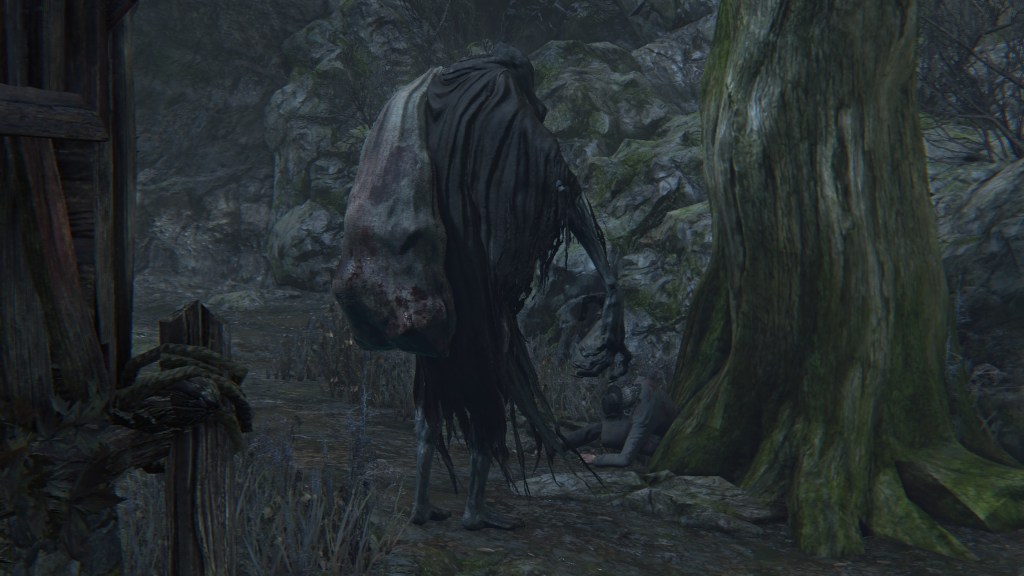 The giant lost child is a hulking humanoid with a deformed head, fattened feet, patches of fur, and a multitude of bodily scars. Its name is more accurately a “foundling giant”, (捨て子の巨人) the term for foundling more literally “abandoned child” rather than just lost. And where do we find the enemy? Solely in the Nightmare of Mensis, everywhere except within the twin churches. This suggests that the giants were abandoned by the School. We are able to loot lead elixir from their corpses, meaning that they have suffered the nightmarish despair needed to produce it — and as Iosefka’s imposter proves with Gascoigne’s youngest daughter, that is a possible product of inhumane experiments on innocent men. True enough, we can collect that same elixir from a cleric corpse in the second church. The creature’s feet are also wrapped in rope, perfect for a human subject tied down as they are transformed into a monster. Taken together, the giant appears to be another failed experiment kicked out into the wilderness.