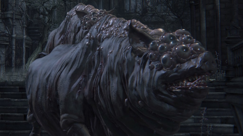 Although this implies the enemy to be a failed experiment, the School of Mensis weren’t hasty in this endeavor. As we ascend the second church’s exterior levels, we encounter a number of nightmarish creatures. First are the familiar carrion crows and mad dogs, the former often chowing on the latter — except their heads are disturbingly swapped. Next are the maneater pigs, except they possess a clump of extra eyes. While it is easy to disregard these as mere creations of the dreamscape, they are more likely products of Mensis experimenting on actual creatures. The pigs demonstrate the School trying to transplant eyes to grant an entity more sight, while the dogs and crows betray their interest in seamlessly replacing the head of one living being with that of an entirely different organism. Both fit as tests in anticipation of transplanting the Great One brain to their own heads, which would require live but not necessarily human subjects. We can even trace the beasts they use to the same source as their human specimens.