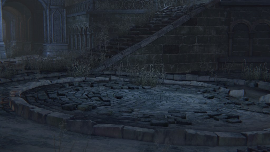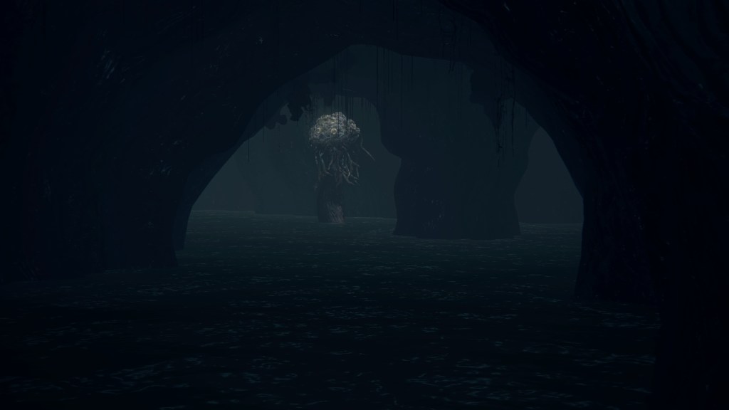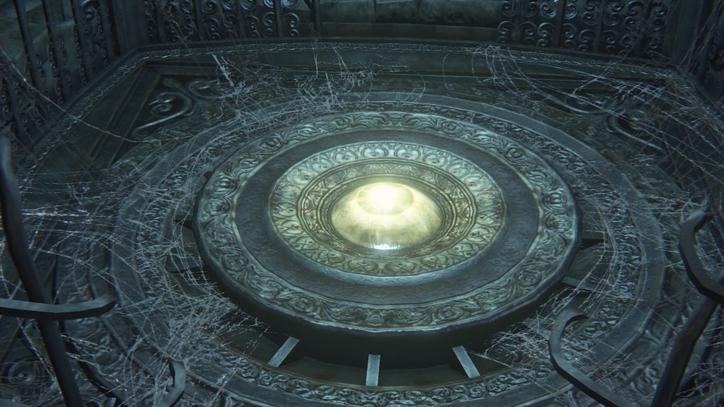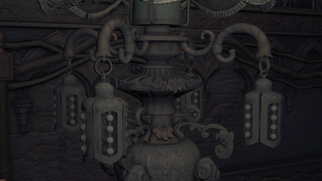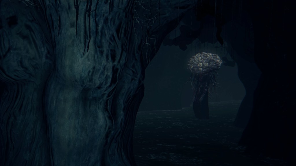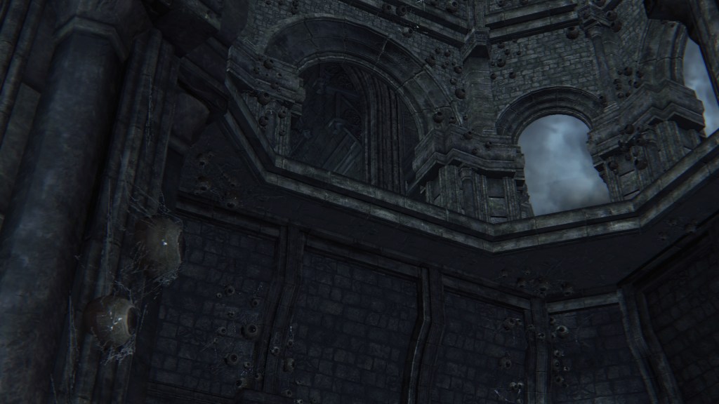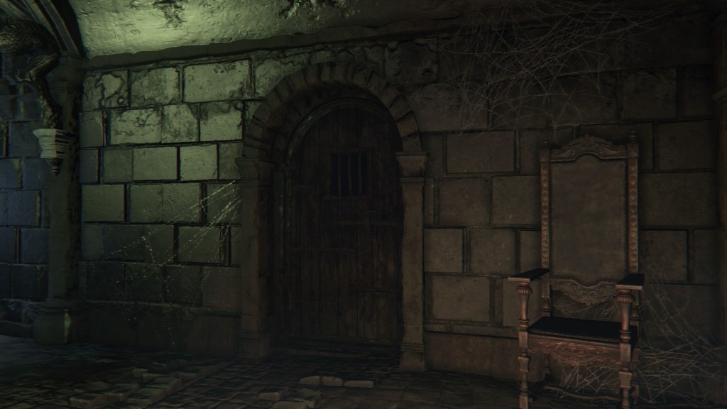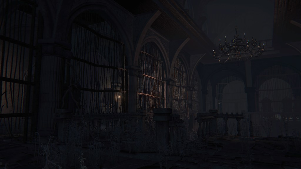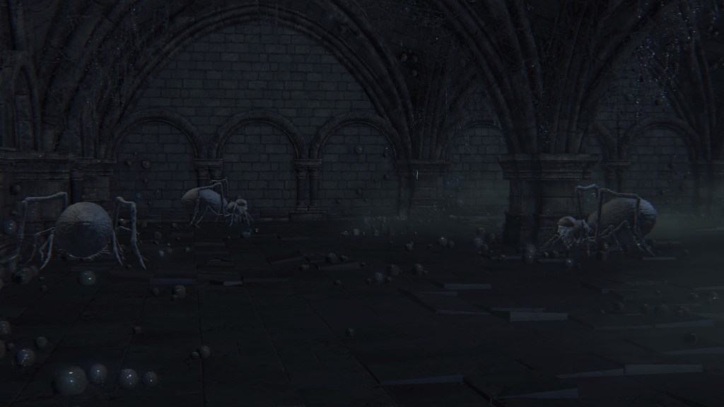 Given that they are called apostles, these clergymen have decided to serve their Great One the same as Rom’s children. But unlike the vacuous spider, Mergo’s Wet Nurse doesn’t care for a posse, so their only possible service is guard duty. Mergo’s attendants aren’t stationed in the first church, so the apostles have taken it upon themselves to guard the building. The lesser kin who couldn’t fully discard humanity have been left to patrol the small chamber on the upper level. Meanwhile, only a handful of the others guard the mid-level rafters, almost certainly due to the winter lantern. The rest hang from webs in the lower-level oratory, ready to “greet” unwelcome guests — including one especially large spider, possibly their leader. Suffice to say, the apostles’ allegiance to Mensis is all but abandoned, most likely hoping that the Wet Nurse will award them new insight to further their evolution should they please her. However, this highlights the Great One’s indifference to Mensis’ plight. Her sole concern is protecting Mergo, hence she has allowed the bottom floor to her church to collapse beneath their feet.