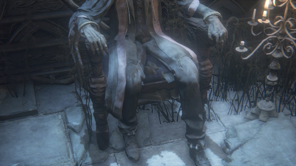 With Mensis’ continued failure both in and out of the Nightmare, it was inevitable that the scholars themselves succumb to madness. Bodies with frenzied blood lay not just outside the twin churches, but also within. Clerics weren’t falling victim to simply the Brain, but the horrors of their nightmarish work in general, which is consistent with Edgar’s current state. Micolash has been the biggest casualty. The man certainly gained great knowledge from the nightmare library. Our boss fight has his perform arcane arts resembling Augur of Ebrietas and A Call Beyond; he also initially hoodwinks us with a doppelganger. But most unsettling are the puppeteered remains he lets fight on his behalf while fleeing through the halls. Given their model’s aged appearance, these corpses are probably his fellow scholars, now ripped to pieces — but by what? Their experiments, or Micolash?