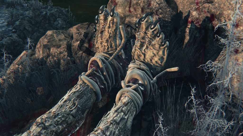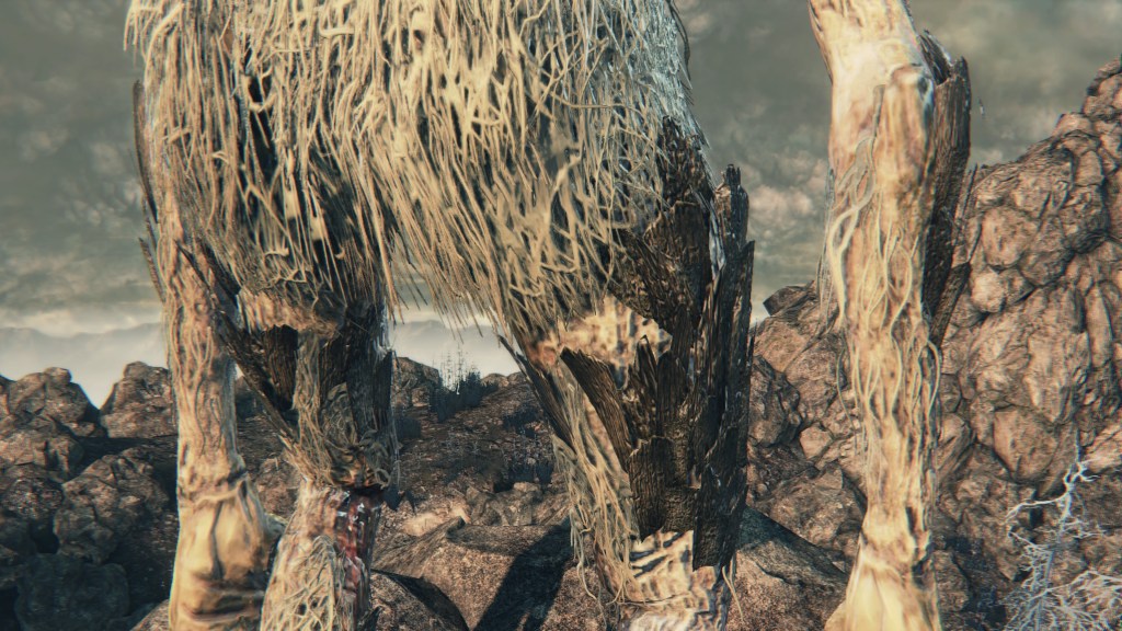 Prowling about Yahar’gul that moonlit night is an unconventional type of scourge beast, to say the least. The infected has grown almost no fur, the body more human in many ways. However, it also looks more twisted and grotesque. The hulking flesh appears to have burst open; skin rent apart, organs exposed, sinew strained. There are also uneven bone growths atop the head, not to mention lines of ginormous teeth extending all the way down the throat and past the sternum. If the open maw with no lower jaw wasn’t already unnatural, the beast’s forelegs sprouted from the thigh and shin of the existing human limbs. Compared to any other victim of the disease, such a person underwent the most uneven transformation. We can infer the cause from the beast blood pellets on the remains, but that still doesn’t explain why such degeneration has only occurred in Yahar’gul. Why does it look like a corpse? In all likelihood, this was the result of inducing the scourge when the body was already a corpse.