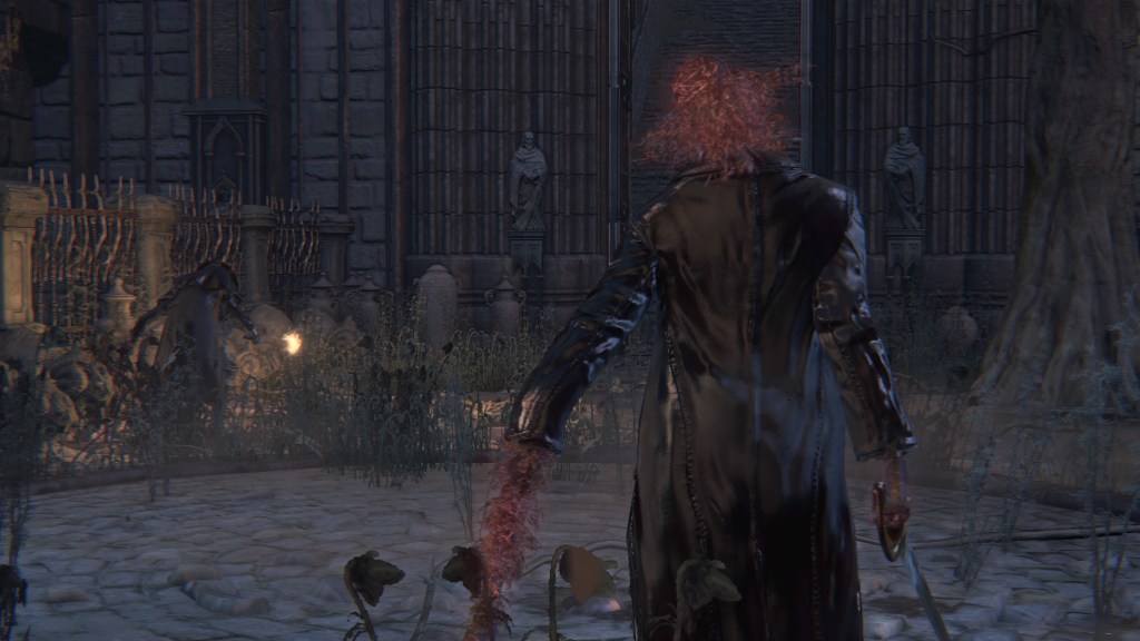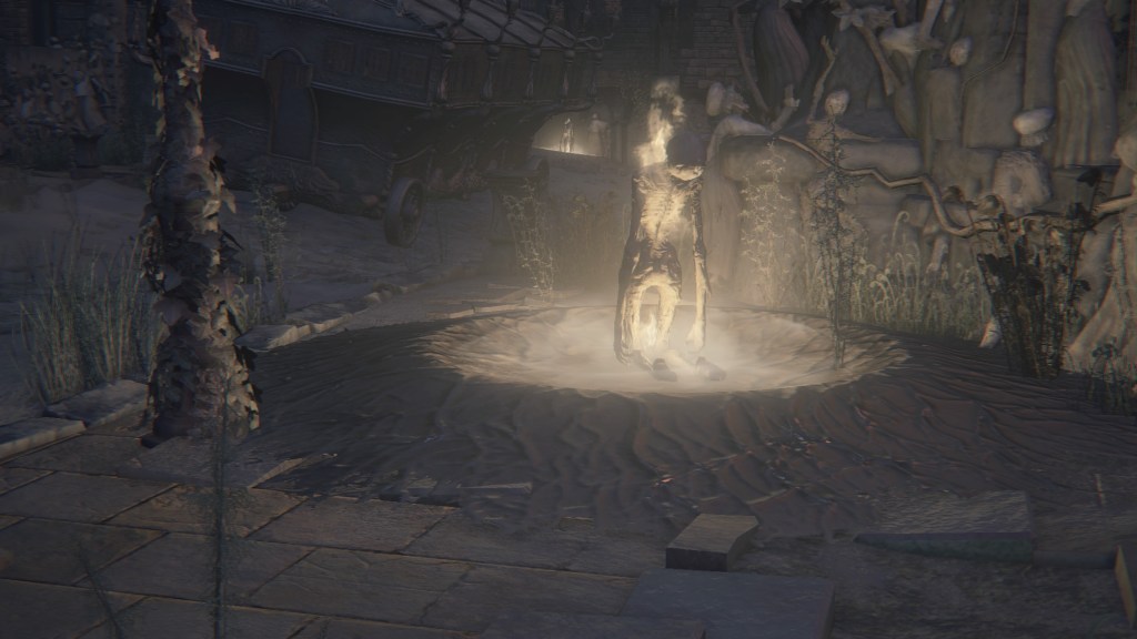Bell ringers throughout town summon men, women, and dogs, the enemies bursting into form from the ground via spontaneous blood and collapsing back into liquid after death almost as quickly. Unlike their counterparts in the Chalice Dungeons, the Yahar’gul clergywomen do not conjure these thralls infinitely, though they will reconstitute those slain. Disrupting their connection with the summoner still momentarily disorients the summons and weakens their defenses. And going by the enemies summoned, these are most likely the kidnapping victims. This includes the Hemwick gravekeepers present, standing in for the Yharnam women abducted in this context. It seems that, even in death, the clerics have found use for their test subjects, resurrecting the souls with their own blood in ghoulish fashion.