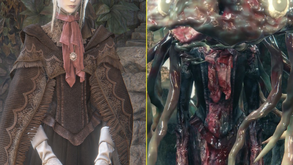 It is more probable that the eye cord we receive was part of Mergo. The Great One is already an infant, with no motive for seeking a similar child. During our entire night in Yharnam, the babe simply cries from within the Nightmare, hardly the behavior of a being with the power to communicate with humans and grant their wishes. Instead, the helpless child is left to the whims of the supposed nursing mother. A Great One herself, Mergo’s Wet Nurse descends upon her ward at our approach, covering the entire baby carriage with her body. Attentive listeners can then hear an audible gulp, the boss seeming to swallow the baby before engaging us in battle. Earlier iterations of this cutscene make the child’s assimilation into the adult Great One more obvious, hence why Mergo’s cries peter out after she is defeated; slay the devouring mother, slay the devoured child. The Wet Nurse is the one in control, not Mergo. Indeed, Micolash is the so-called master, yet our victory message is “Nightmare Slain” only after hunting Mergo’s Wet Nurse, implying that — like the Moon Presence — the Great One boss is actually fueling the dream. And she clearly wants to be a surrogate mother.