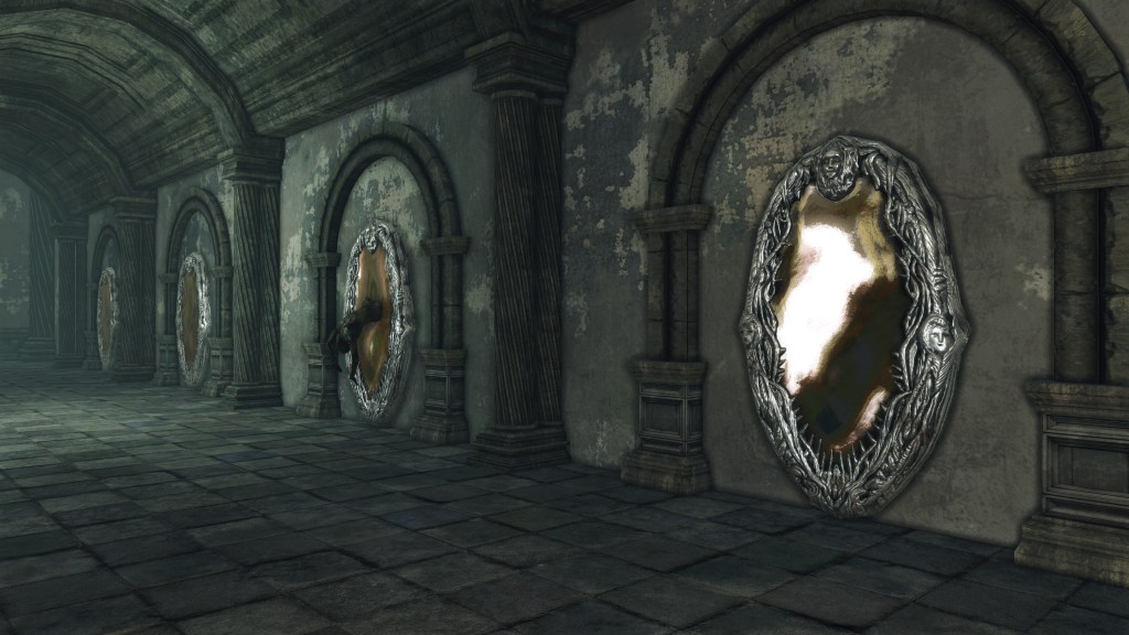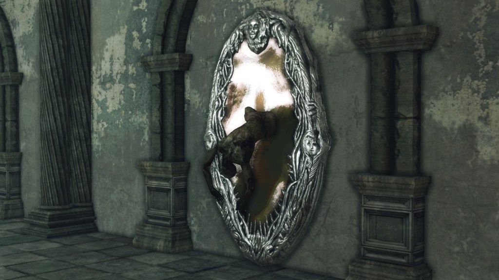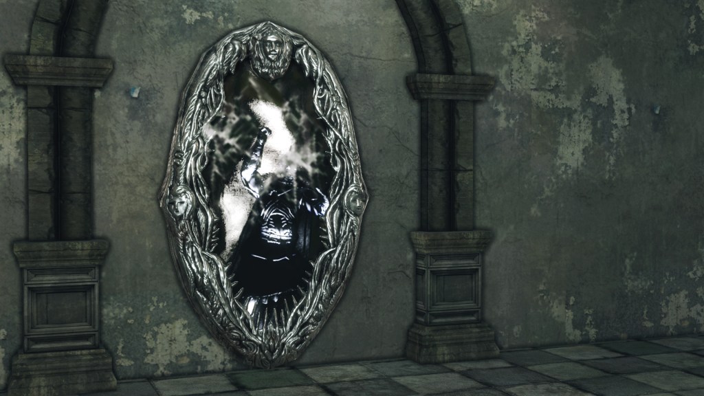The mirror shield is, unsurprisingly, a product of Aldia, a number hanging in his manor. The corpse dangling halfway out of one glass portal highlights the trial and error in developing this summoning system. And yet, when we pass other mirrors by, we find mirror retainers already sealed inside, the spirits breaking free to stop passing intruders like us. Either these retainers were accidentally summoned to the wrong mirror, or they have been imprisoned as spirits the entire time, success cases with the prototypes. Assuming that the knights acquiesced to be the manor’s unconventional guards, this isn’t in itself odd. Summoning people as spirits via magic mirrors naturally begs for people as test subjects. Still, this implies that certain ranking knights were willing to take on this dangerous and solitary task in obscurity, whereas others preserved the ambition to strive for further heights. Stranger still, their absence can’t have gone unnoticed by the king. Yet nevertheless, Aldia had his brother’s approval for this project, even provided a key to the trial ground which he kept atop his tower at the castle.