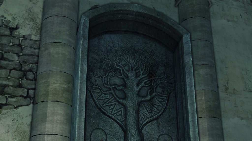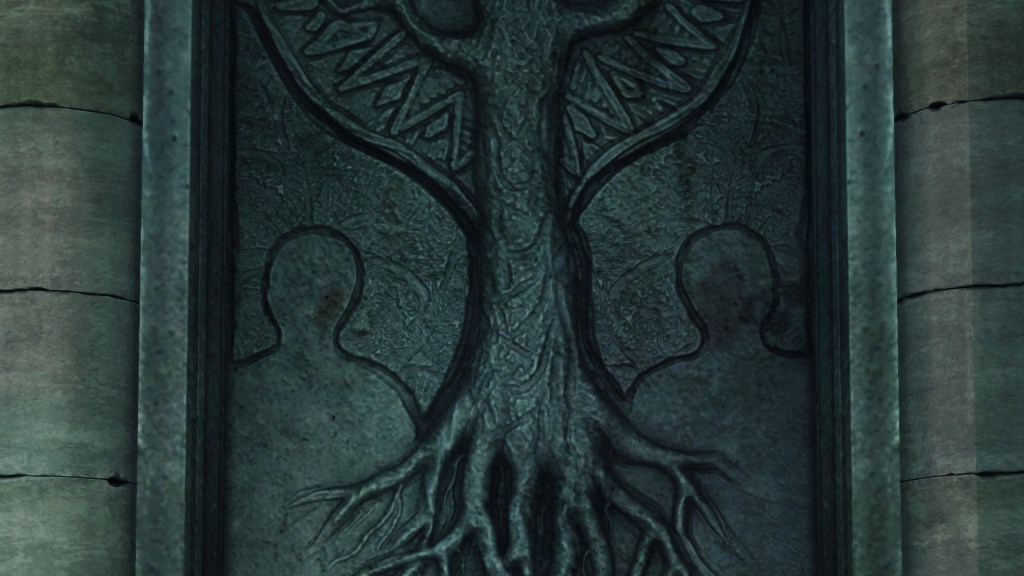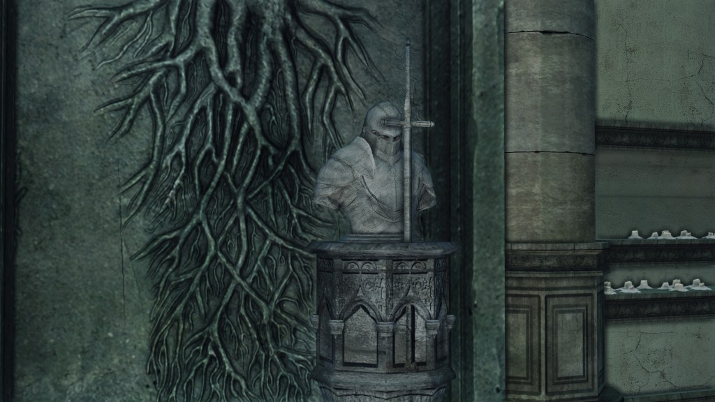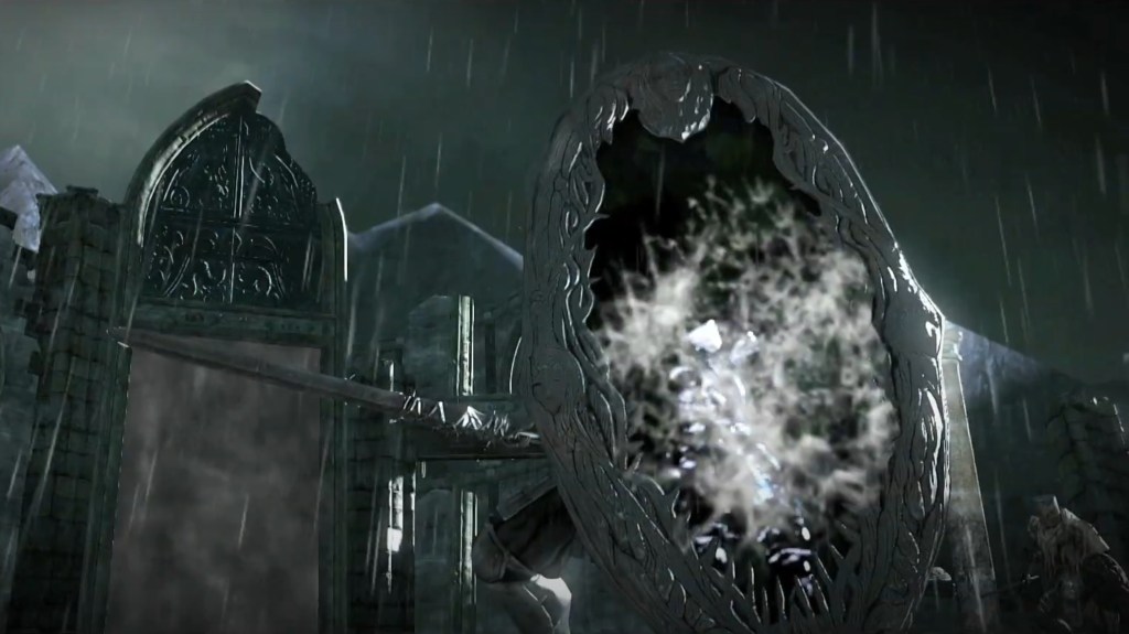As the description insinuates, the mirror can be used to summon warriors from other worlds. This is illustrated by a shrine at the beginning of the King’s Passage, the warrior’s bust before a wall icon of two vaguely humanoid figures at either side of a large tree growing a tangled mess of branches and roots. This carving not only represents the stagnant flow of time complicating cooperation between two parties, but also the network of connections enabling cooperations across different timespaces. This is evident from writing down a red summon sign in the vicinity, the boss subsequently summoning the person as a spirit to assist in the trial. The person begins sealed inside the mirror, but quickly bursts out of this mirror dimension after banging on the glass “portal” a couple of times — though the cracks and shattering seems to come from the mirror dimension and not affect the shield. While evocative of Through the Looking-Glass by renown author Lewis Carroll, this magic says much about the nature of the trial.