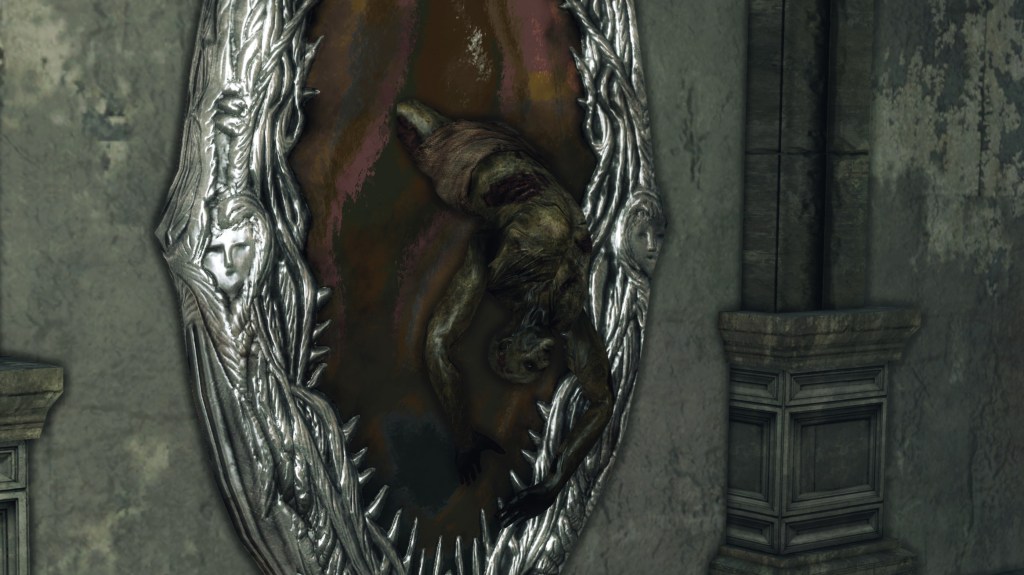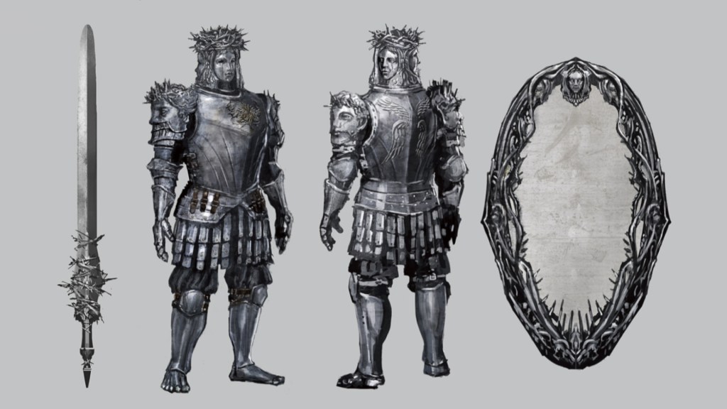In the back of Drangleic Castle, at the end of the King’s Passage, lies the impressive “brave warrior’s chamber” (勇士の間) for the castle’s mightiest. This hall of heroes is a trial ground, where their valor is tested against the Looking Glass Knight. Fashioned with silvery metal, the boss’ weapons and armor incorporate crowns of thorns, with the added angel wings carved in the back and Drangleic crest emblazoned on the chest in gold. Factor in the multiple faces, the helmet mask weeping, and this imagery conveys the knight as no one person but stand-in for a collective of the kingdom; portrayed like Christ, the Suffering Servant and intermediary between man and the divine. The mirror knight thus seems to represent the ideal for knights of Drangleic — to suffer and lay down their lives if necessary for king and country. To take on the trial is to measure oneself against that ideal, to see if you can live up to it. Only the strongest of warriors, with the courage to use that strength, may overcome this foe and achieve the level of Vendrick’s elite entourage.