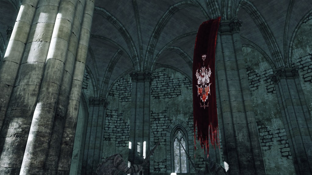 Naturally, this duel was a serious affair. A knight had to first be recognized for his strength and valor before he would be allowed to challenge the Looking Glass Knight. And even before coming face to face with the boss, walking down the corridor to the hall of heroes steeped them in symbolism. You are walking the path of a hero, following the footsteps of many who came before — when you arrive at the destination, will you demonstrate heroism, or hubris? As new trainees anticipated their answer, they passed under red banners fluttering Drangleic’s crest with all its vassal heraldry; a reminder that the newcomers embarked on becoming the safeguard to one king, one kingdom, one nation. Indeed, knights after the Dragonriders were liable to not be the soldiers Vendrick led to the land but the natives they conquered. This propaganda aimed to instill those aiming for a place nearer the king with reality: the country’s bloody founding was in the past. Whatever their individual origin, they were now knights of a unified Drangleic, so must hold no dual loyalties. If they took up a sword, it was in noble service to their rightful leader.