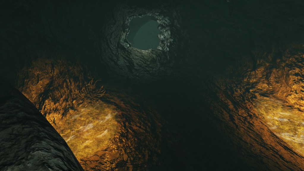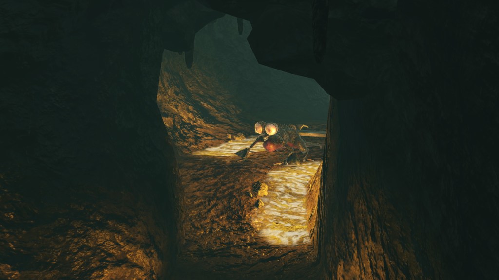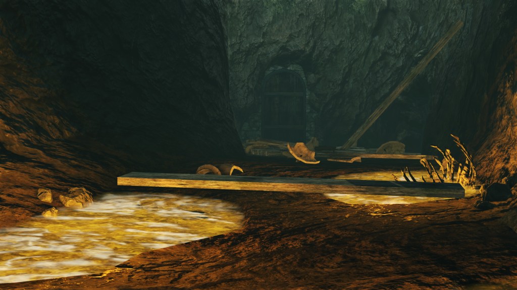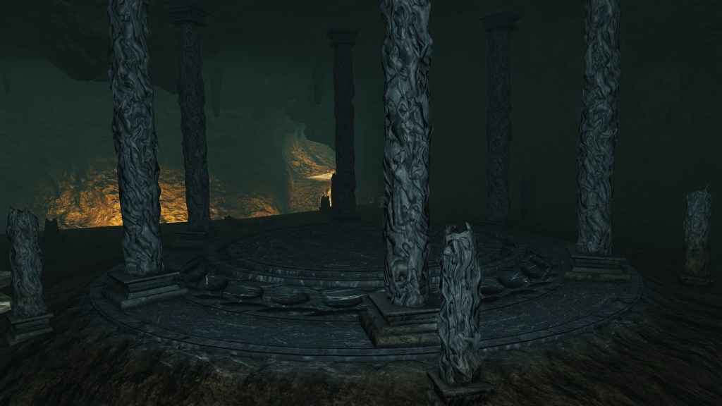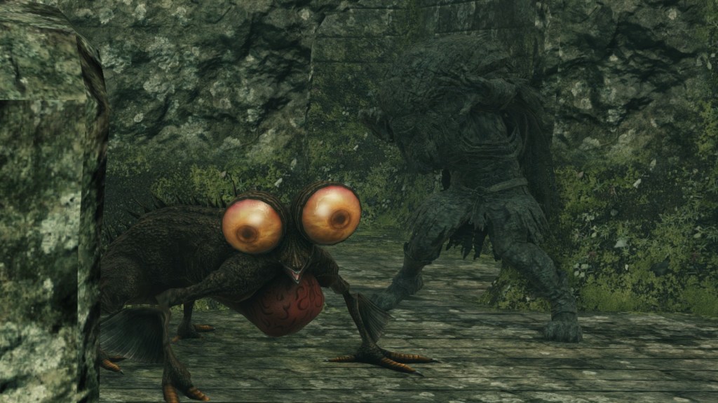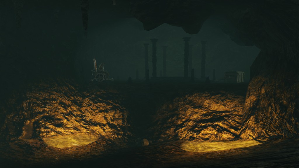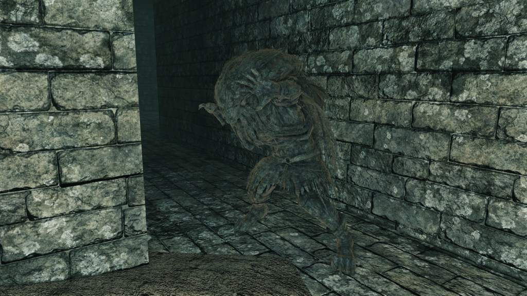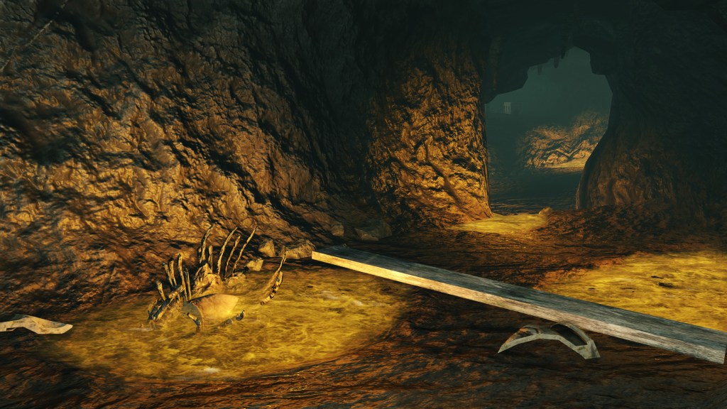 The key opens a wooden door to a stone chamber unlike the surrounding mossy ruins, likely built by the tribe. The Lion Clan apparently uses it as a dungeon, since Ornifex is locked inside against her will. But why? The answer lies just outside her cell. As we travel through the cave beneath the Lion Clan’s territory, we navigate numerous acid pools littered with beast bones and pieces of the curse pots leading up to the altar for entering the Dark Chasm of Old. The clan’s barbarity combined with its Dark obsession suggest that the lion-men perform some kind of ritual animal sacrifice in tribute to this monument to the Abyss, Ornifex captured to be the latest offering. The purpose is evident from the instructions for Homing Soulmass stored by the altar. The sorcery first invented by Logan in DS1 nevertheless behaves like the dark sorcery devised by the more ancient Manus. What we acquire might therefore be the fruits of the lion sorcerers’ initial research, learning about autonomous souls before bringing dark souls to life. The clan shamans had been trying to enrich their primitive understanding of humanity.