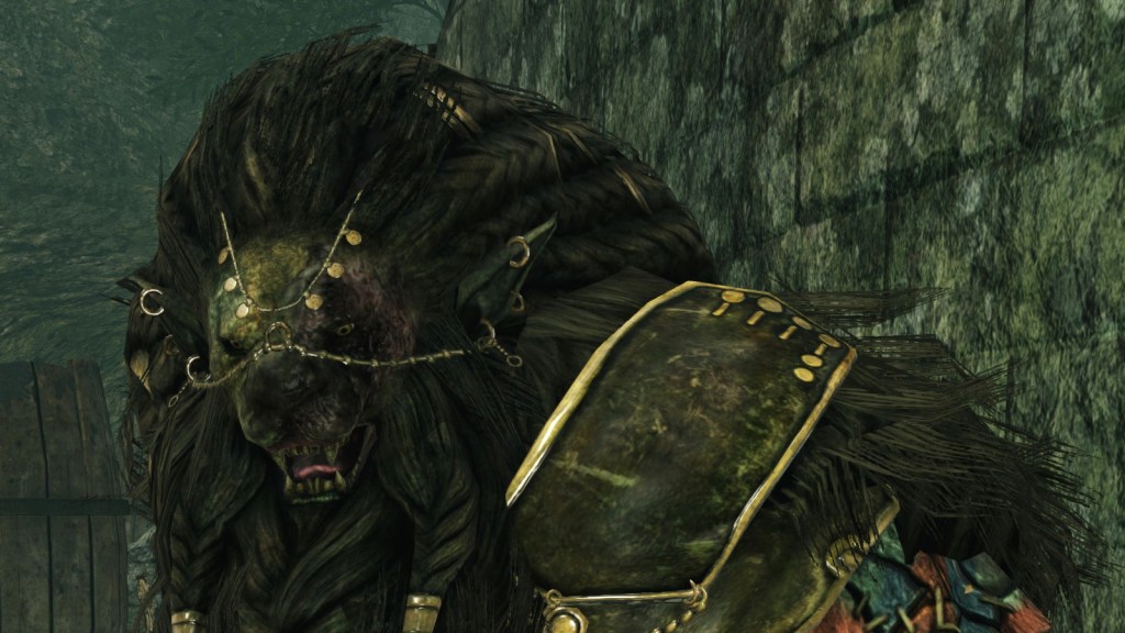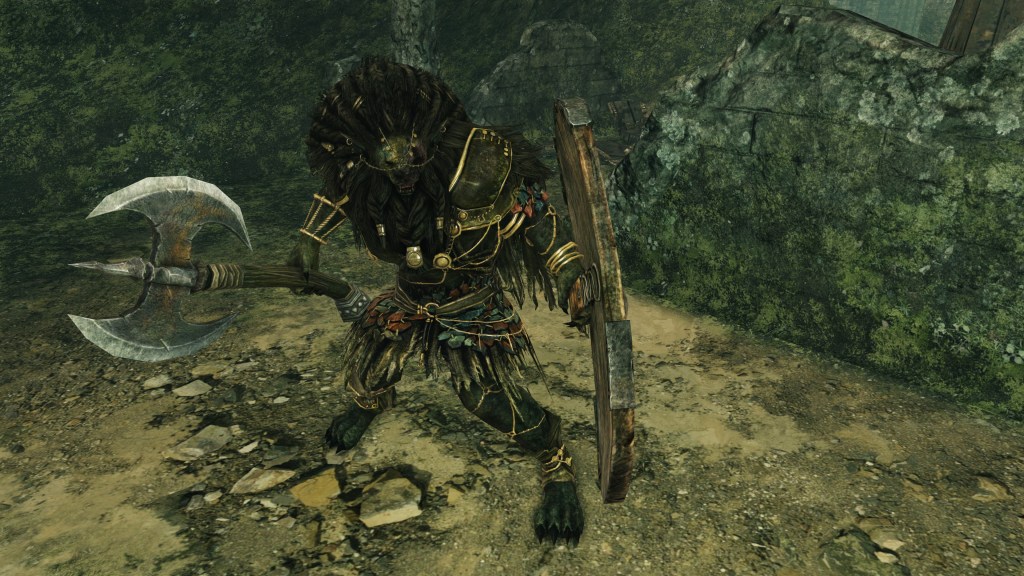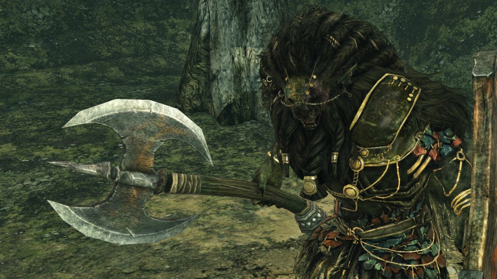 However, naturally-occurring beastmen don’t exist in Dark Souls, as stated in the Dark Souls II: Design Works interview, with concept artist Daisuke Satake instead suggesting that they were humans transformed by some “influence”; (影響) perhaps a curse. Indeed, the race inflicts the curse status upon attack, and exceptionally high curse resistance is characteristic of their equipment. The description for said equipment also notes their abrupt appearance in the historical record, implicating an unnatural origin. While it does also label them as “demi-humans”, (亜人) the description of their highly-refined weapons affirms them to be far too sophisticated for subhuman monsters or even ignorant yokels — this is, or was, a developed people despite the rustic look to their dress.