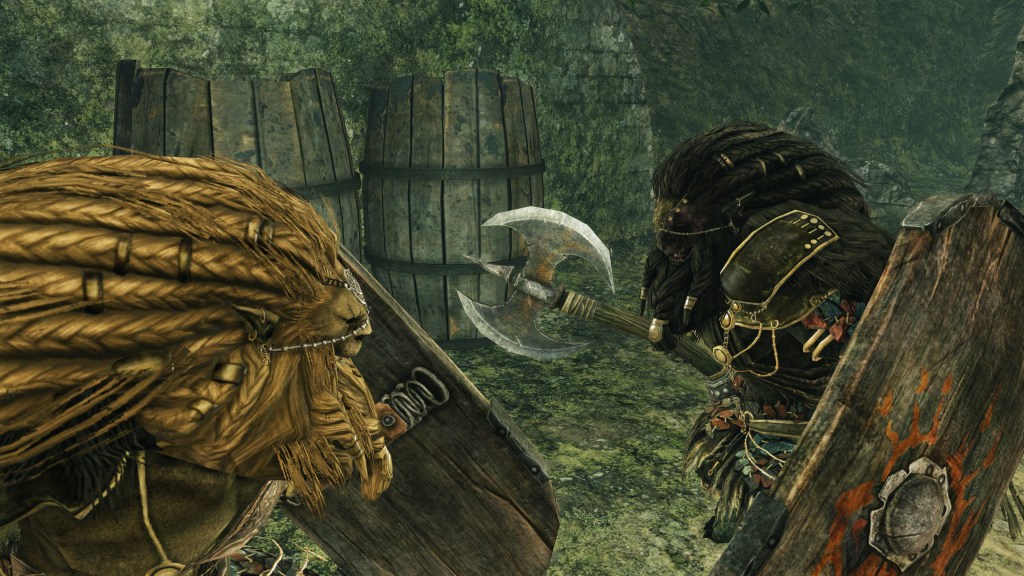 Even without the disarray, the Lion Clan has little chance to recover. They have refused to integrate into society for too long. The curse of the laughing pots is proof of the enmity they have earned toying with real men’s lives. Maybe they have built an immunity staining their hands with such indignant souls, but how they can they possibly return to the world of man as decent folk after this? Now their sorcerers are absent, presumably dead, and it would be madness to continue with their twisted research at this point in light of their lack of findings. And yet, their hostility to our presence in their hour of need shows that they intend to persist. None may see their shameful forms, differing them from “ordinary” folk. Like a certain white dragon from DS1 whose works still haunt this land, their obsession leads them to cling to things they should know will not save them — not their god, not even their humanity. They will never be Forossans again, assuming they still had that nation to call home. Their smithing and their religion are the only remnants of that once proud culture.