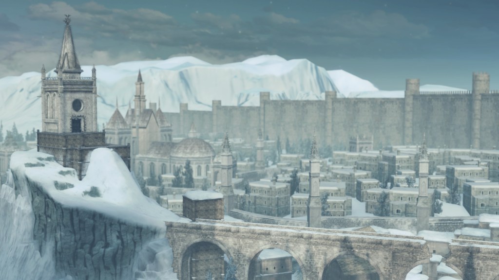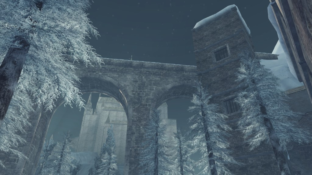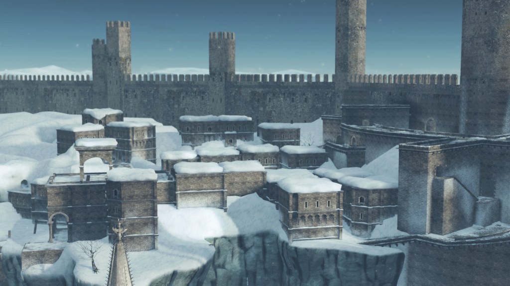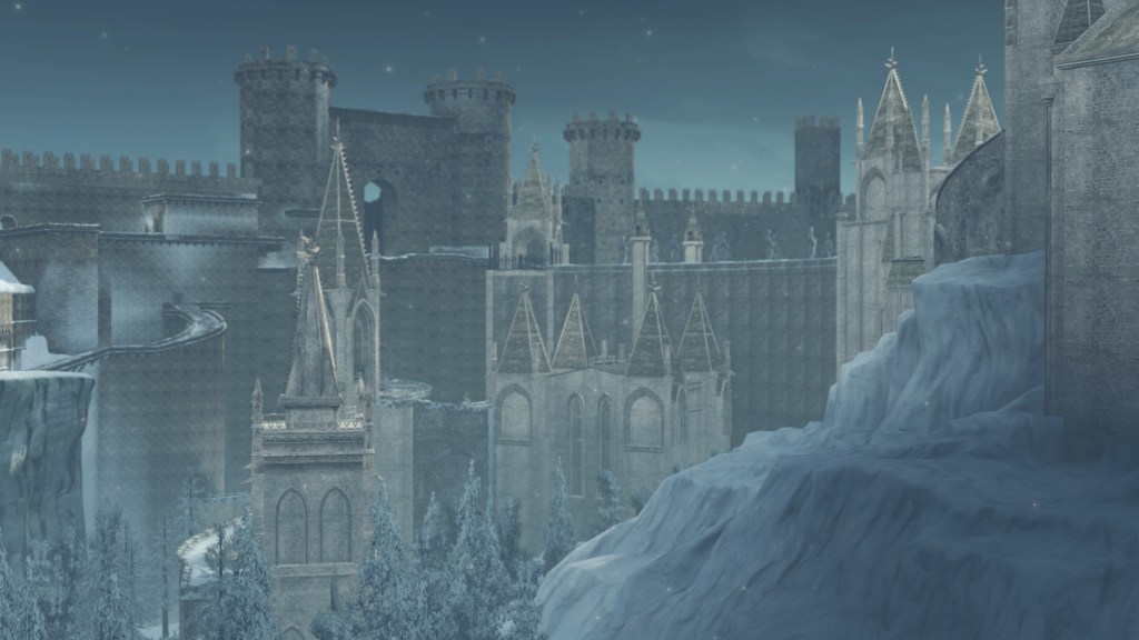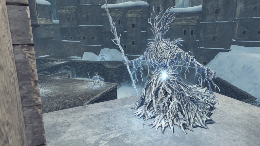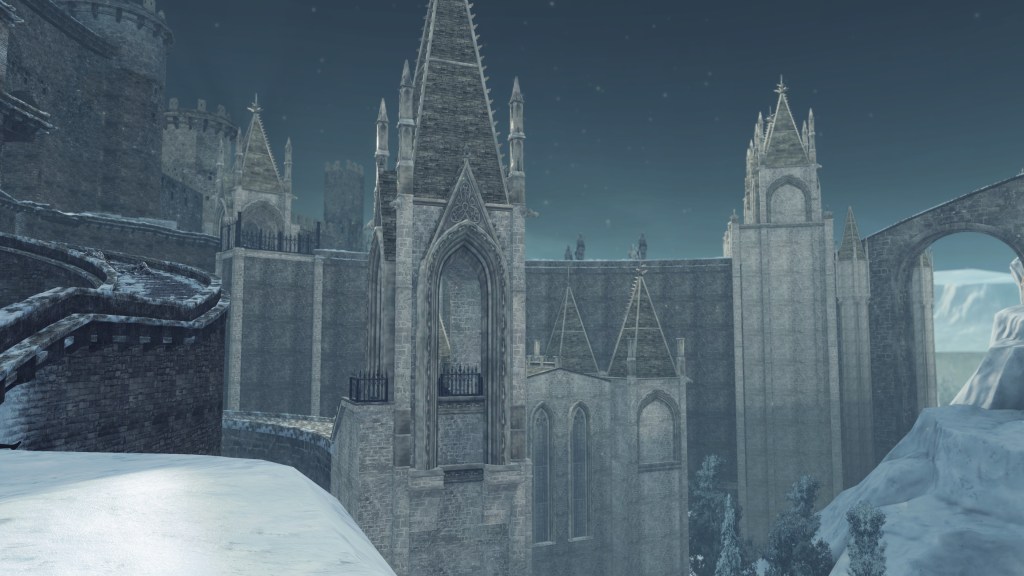 In the silent priestess’ account, Eleum Loyce has been plunged into eternal winter ever since it lost its king. Snow drapes the northern limit far into the horizon, becoming a “lifeless world” devoid of foliage save for some surviving trees behind the walls. Description to the Frozen Flower notes how this key to Eleum Loyce seems to be robbed of its heat from the cold — an odd detail to highlight when cold normally robs the heat from things. However, considering that the stone flower has remained frozen even after sitting in a much warmer climate at Drangleic Castle for who-knows-how-long, the cold freezing this stone ornament is clearly unnatural. The icy winds originated from inside the capital, their force flinging open the Ivory Gate before spilling out into the wider land. And when we confront Alsanna and earn her trust, it is she who calms the winds freezing over the path to Chaos among other things. She even uses this power to form icy tendrils to block our path or otherwise discourage journeying onward.
