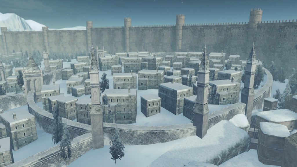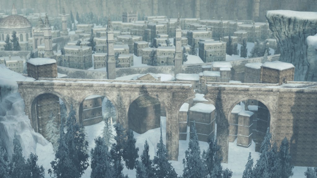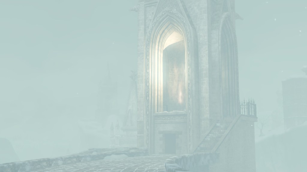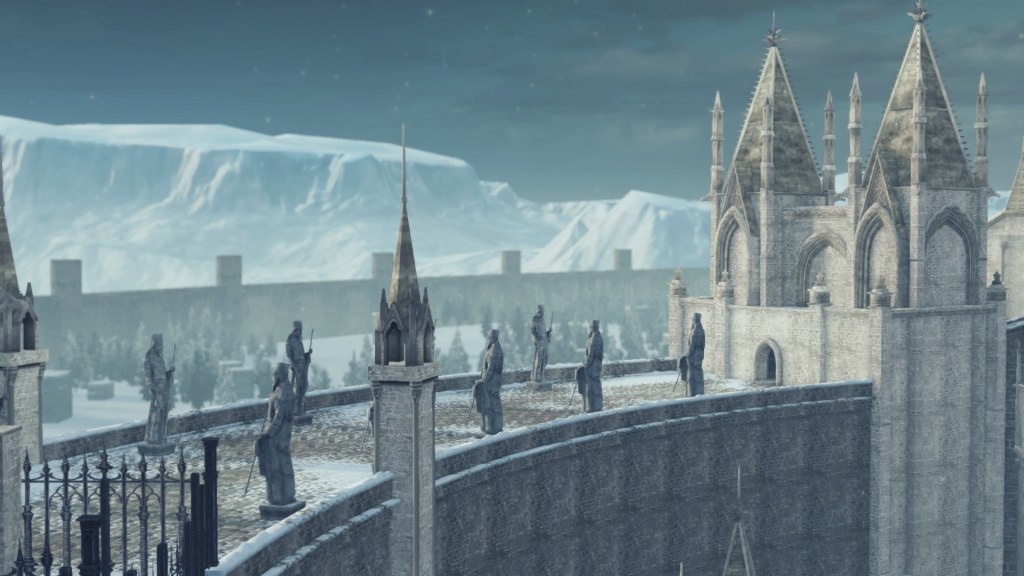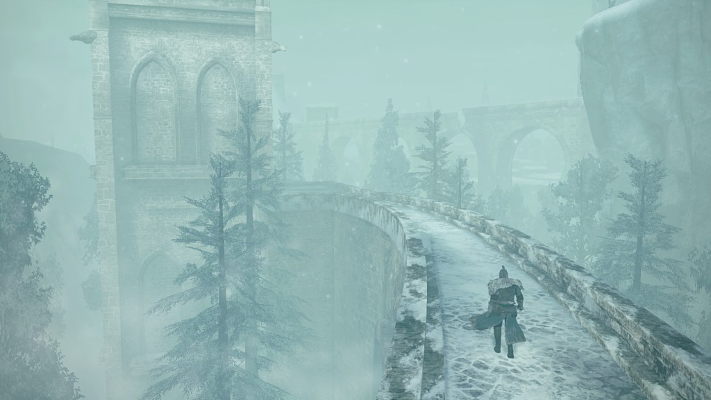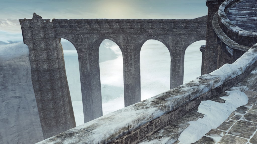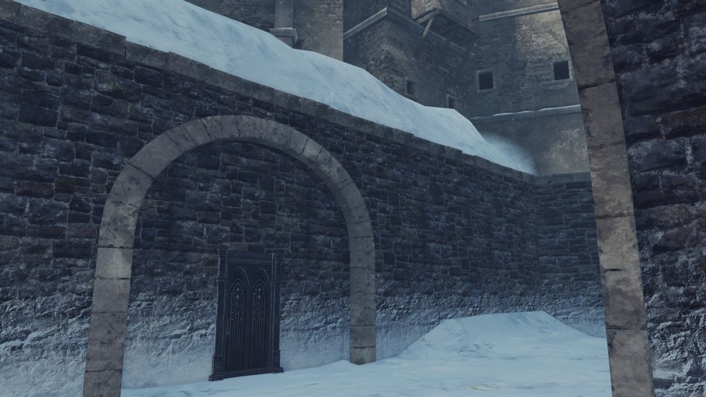 In the silent priestess’ account, Eleum Loyce has been plunged into eternal winter ever since it lost its king. Snow drapes the northern limit far into the horizon, becoming a “lifeless world” devoid of foliage save for some surviving trees behind the walls. Description to the Frozen Flower notes how this key to Eleum Loyce seems to be robbed of its heat from the cold — an odd detail to highlight when cold normally robs the heat from things. However, considering that the stone flower has remained frozen even after sitting in a much warmer climate at Drangleic Castle for who-knows-how-long, the cold freezing this stone ornament is clearly unnatural. The icy winds originated from inside the capital, their force flinging open the Ivory Gate before spilling out into the wider land. And when we confront Alsanna and earn her trust, it is she who calms the winds freezing over the path to Chaos among other things. She even uses this power to form icy tendrils to block our path or otherwise discourage journeying onward.
