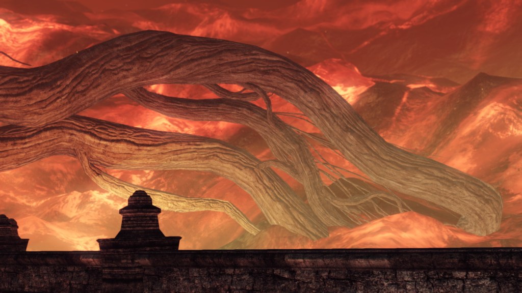 The stone and wood, of course, are the most primal matter as Disparity first brought emotion to ens, so are theoretically at their strongest in nil beginning. Returning to “zero” also benefits the soul of fire, though for different reasons. We, who are on the path to link the fire and have in all likelihood done so after finishing our journey, would arguably be enlightened individuals who put our egos aside for the world, which only increases as we continue journeying through NG+ and beyond. This loss of ego perfectly resonates with the state of the universe before flame, when there were just stone dragons and trees in an equally rocky earth. And more practically, our single character’s repeated “firelinkings” across multiple playthroughs continue to strengthen the First Flame by adding a larger and larger soul to kindle — which can theoretically resonate with the stray soul from Flame imbued in the Curved Nil Greatsword. Therefore, our extended adventure through the same narrative over and over would empower the sword in kind.