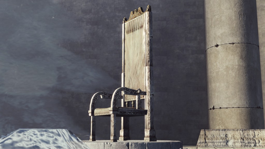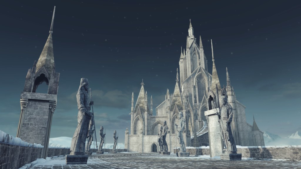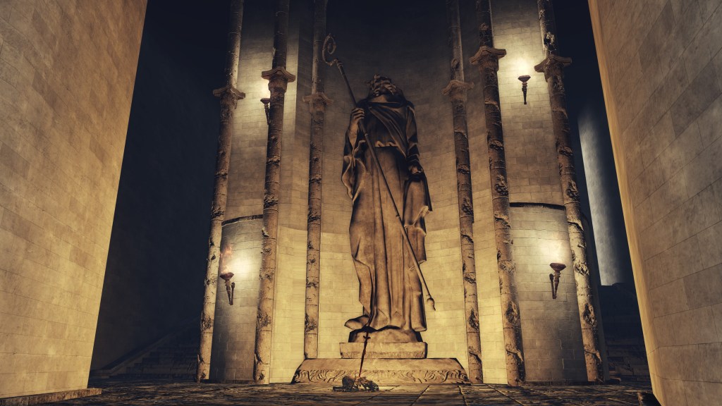 Although the knights were perhaps the most martially able of the king’s comrades, they were not the only ones to work so closely with him. When the Ivory King placed his throne over the pit to Chaos, it was not within a palace but a church. The man had a grand cathedral constructed on the spot where he would appease the flame. With this was the establishment of a new Loyce religion, with the country’s king as its high priest. In the leadup to the cathedral, we pass many statues of a bearded man dressed in robes and a tall hat wielding a staff, a bishop’s crook specifically once inside the building. It is clear that the figure is supposed to represent the religious authority headquartered within the church. And the only function of this cathedral, aside from sealing the Old Chaos, is to meet with the king on his throne, the audience chamber complete with a stand down the red carpet to step up and address the monarch likely seated on high directly above the pit chamber. In other words, the Ivory King must hold both temporal and spiritual authority.
