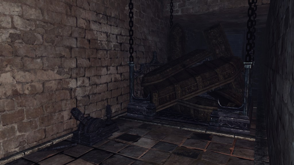 As the ivory kingdom dragged on, it inevitably had to contend with the Undead curse. Their solution was stereotypical. Hollow prisoners loiter together at the outer walls, absentmindedly waiting to be shuffled into the “exile chamber”. (追放の間) Although now in ruins, this special room built into the rampart still maintains a number of coffins we use to slide into the Frigid Outskirts. A few levels down, a lift inside the rampart holds the same coffins for ease of transport to the higher stratum. Though the lower lever to the lift has since been inconveniently broken, Undead and coffins were apparently regularly brought up the outer rampart, where they would stuff inside and haphazardly dumped outside the walls from the select area. We do find brightbugs within a chest in the rampart tower just across from the Expulsion Chamber, perfect for pacifying unruly undead before expulsion. It is also easy to imagine the kingdom collecting the insects when the Undead Crypt is also situated at the northern extreme. Nonetheless, the city had no intention to transport their cursed to the mausoleum.