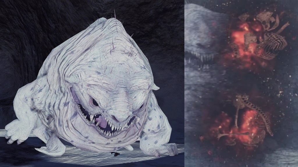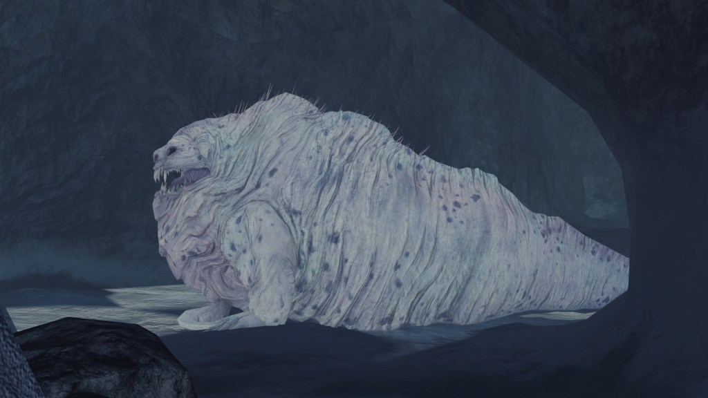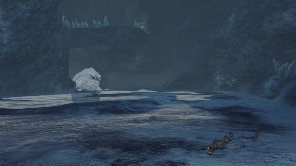While exploring Eleum Loyce, we will descend into an ice cave that a certain creature has made its den. This enemy is identical to the Covetous Demon encountered at Earthen Peak save for its snow-white color, presumably resulting from the cold weather. Even accounting for the developers reusing assets, it is still a hefty slug-like creature which has gorged on many a man, bodies stripped to the bone laying all around its territory. If not related to the boss down south, this Covetous Demon no doubt greedily devours life by nature all the same — fitting that they are named internally after Jabba the Hutt, an equally gluttonous slug-like entity from Star Wars. And when the cave dweller hurls up the bones of its victims, its stomach acid glows a deep red, unlike its boss counterpart. Considering the location, this can only be because the demon was born from the Flame of Chaos, whose pyromancies manifest a similar color. This demon is an example for the kind of twisted life created while the Old Chaos ran rampant.