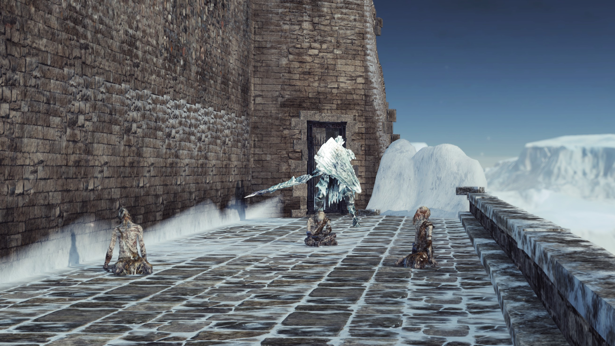 Turned blue covered in icicles, the soldiers and priestess retainers have formed new armaments from the ice, the warriors using them as catalysts to perform a kind of ice sorcery functionally similar to soul arrow. In the case of the wall defenders, their mastery is so grand that they are willing to throw their lances before generating new ones out of thin — or rather, cold — air; they also impale the weapons into the ground to generate a line of jagged ice crystals. The Ivory King’s intelligent pets have likewise picked up on how to perform this sorcery without any catalyst, conjuring multiple ice projectiles akin to Homing Soulmass. Even the Loyce knights will seal portals to Chaos with ice before their last breath. Whether all aware of the source or not, the Ivory King’s subjects clearly taught themselves how to manipulate the cold now blanketing their land. Eleum Loyce’s defenders continued to perform their duties to the best of their own abilities. With or without the king, the ramparts must stay strong.