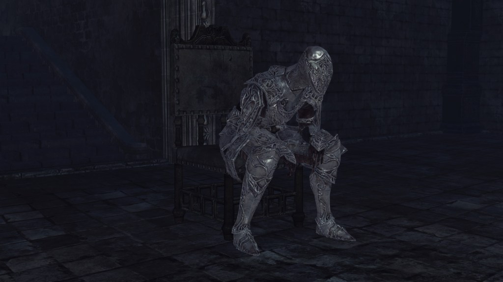 But much like the Silver Knights loyal to Gwyn after the demon war in DS1, they all simply got burned. The knights’ armor has been scorched, the helmet melted. This charred state is a result of constant burning by the flame, the power of life it has imbued into the metal evident from the gradual healing effect of their shields. The knights themselves have received some of that power, several employing pyromancy. Curiously, they are affected by Soul Appease, suggesting that the survivors turned Undead and since hollowed. Nonetheless, they are puppets of the Old Chaos, their wills lost; unable to resist the direction to slay even former comrades should they threaten the Flame. At the same time, the description to their souls insinuates that it is their memories that guide the Hollows “home” even if for such a tragic outcome, grief undeniably remaining even after the death. Their minds may be lost, but some fragment of their former selves remain, instinctively drawn as they are being manipulated for it. Their only hope is for Alsanna to one day bring their sad and sorry souls solace.