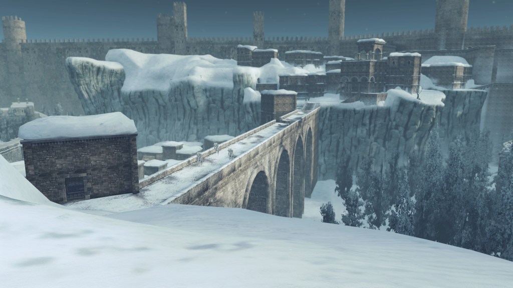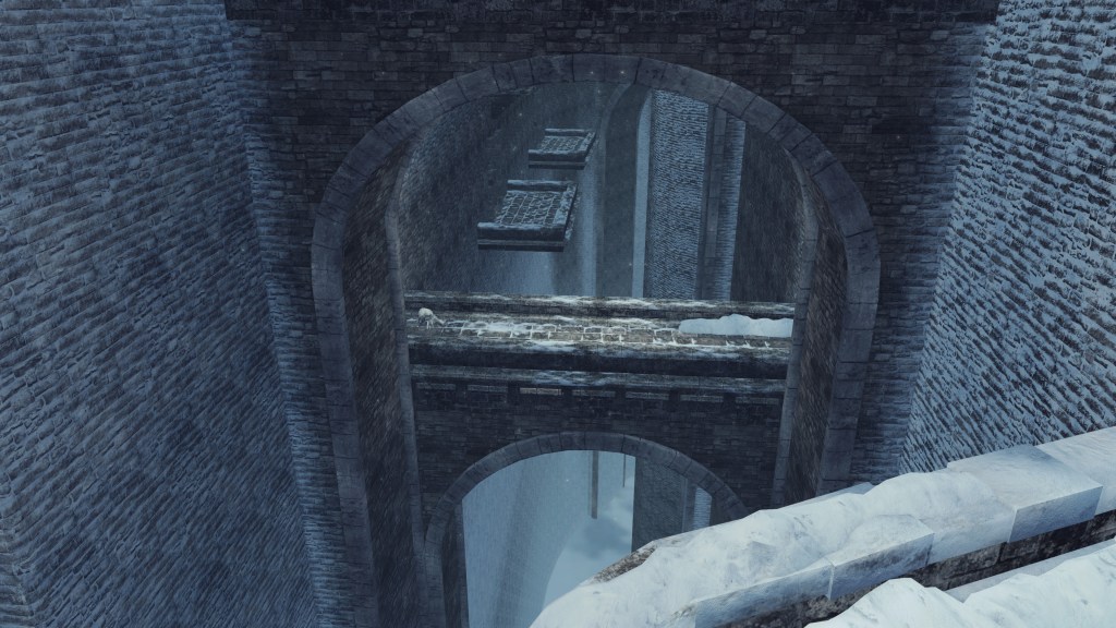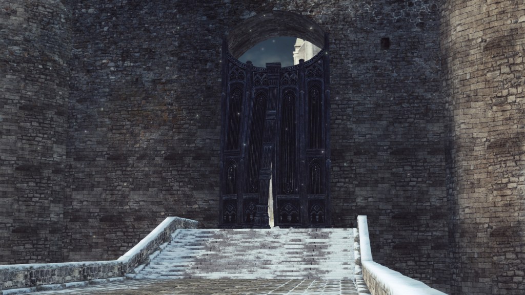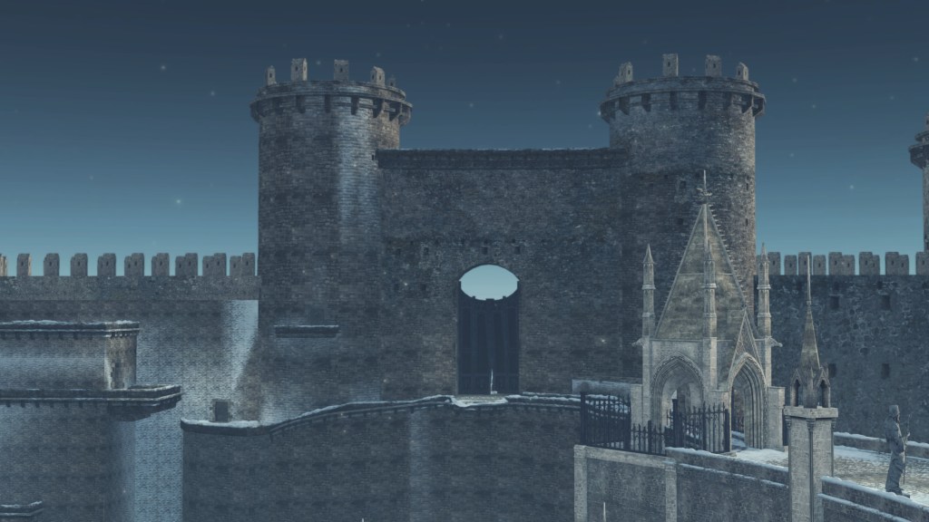 As the metropolis was built up, so too were its defenses. The cityscape is divided by a web of walls separating the areas into yet more district. But iconic to Eleum Loyce is its massive rampart, the castle wall stretching far around the front of the capital. Besides protection against hypothetical invaders from the south, the wall serves to keep the grotesque monstrosities the Old Chaos generated in, though leaving the back of the city exposed does seem to undermine this intention — perhaps this kingdom in northern Drangleic lacked concern since the demons would inevitably be stopped by the sea soon enough. Putting the walls’ extent aside, it was impractical for outsiders to enter from anywhere but the front. Access was facilitated by a viaduct; how far is impossible to infer from the bridge’s current state of ruin. It also diverted to a secure tower regulating access to the altar to the Shrine of Winter, so they were conscious of possible visitors from the south. Still, the metal doors prove that any access point was strictly regulated, as much for their own protection as Loyce’s safety.