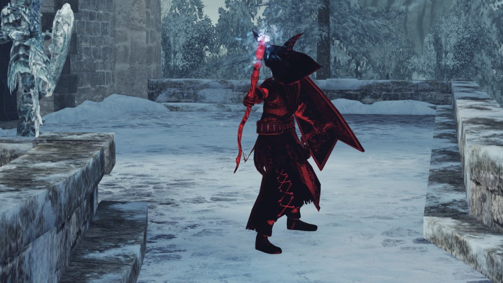 The last two are employed by Hexer Nicholai, a former priest of Drangleic by dress. His miracles reveal that he was a devout man to the gods of light, but the description to Dark Dance wonders if the dense humanity dances for joy at being liberated as much mockery toward the opponent. Perhaps Nicholai felt the common constrictions to men of the cloth, the humanity within him begging to be unleashed. Considering how the text likewise claims that Dark Dance embodies the extreme end of man’s twistedness, his heresy is the backlash of a repressed life. Self-discovery led him to embrace hexing as an outlet, no longer using his powers of sunlight or the Abyss for anyone but himself; that harmonious synthesis of both may be why he also knows Promised Walk of Peace. The fact that Nicholai can cast even Splintering Lightning Spear suggests that he has come to the icy north for the knowledge frozen in the place. With a cleric’s pilgrim shield in hand, the hexer explores Drangleic for further power, his chains broken — oddly fitting that “Nicola” (ニコラ) originates from Greek to mean “the people’s victory”.