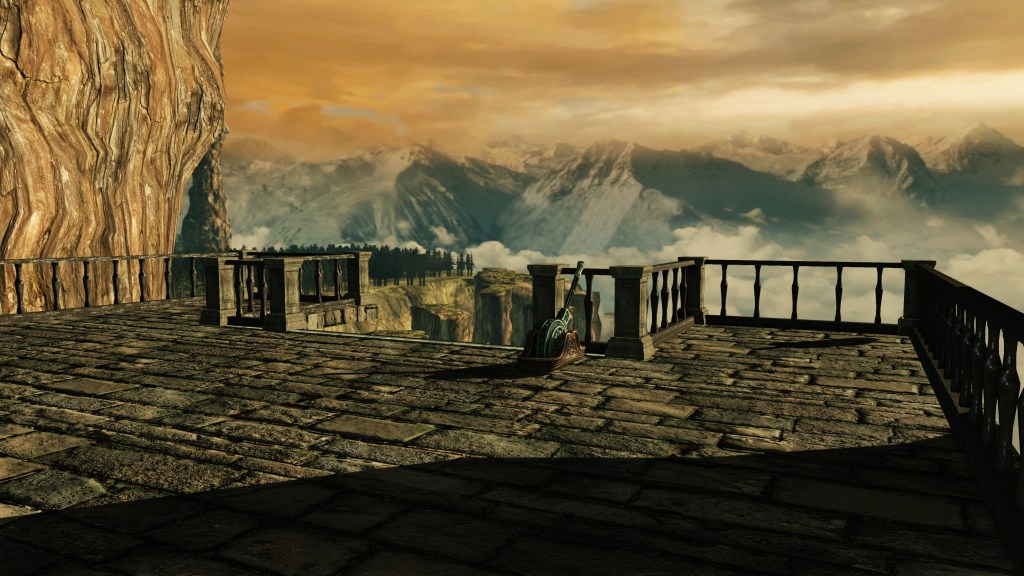The stone and wood by themselves seem unassuming, if unconventional. However, the text posits that there is something qualitatively different about the soul, though it is apparently subtle. The sword certainly doesn’t manifest any magical enchantment or elemental power. And when it comes to combining rock, trees, and souls of a differing variety, what springs to mind is the transition from the Age of Ancients to the Age of Fire. The Curved Nil Greatsword more or less embodies the state of the world during that moment, dominated by grey crags and archtrees just as newborn Disparity began adding color. In other words, the unique soul may well have been taken from the First Flame before it began to fade. We do find twinkling titanite and petrified dragon bone stored in the same Church Town inner wall as the curved greatsword, so there was an interest in stone and light’s age-old history at Eleum Loyce. Whoever crafted the weapon, it was this insight into the world at the beginning that attracted the Ivory King’s attention. And it is that microcosm which gives the sword its potential.